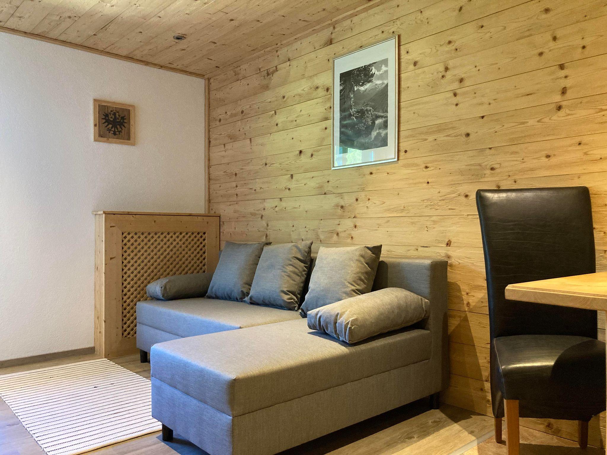 Ein gemütliches Appartement mit einem Schlafraum und einer separaten Wohnküche. Die neu gestalteten Wohnräume sind mit viel Antikholz modern ausgekleidet und rustikal dekoriert. Direkter Zugang zum Balkon durch den Schlafraum und die Wohnküche mit dem Blick übers Leutaschtal. Das Bad wurde 2022 komplett saniert.