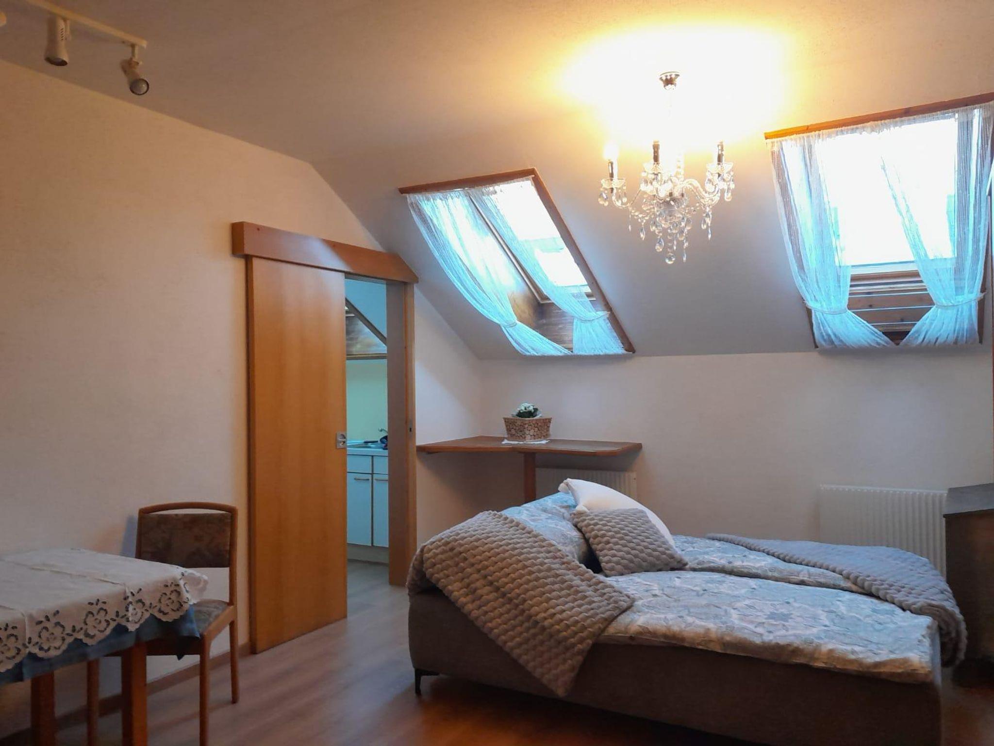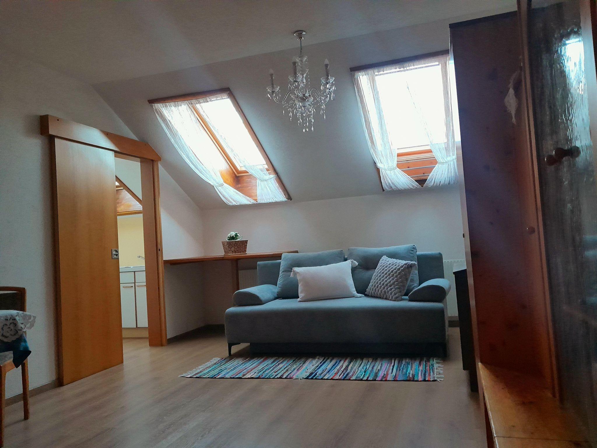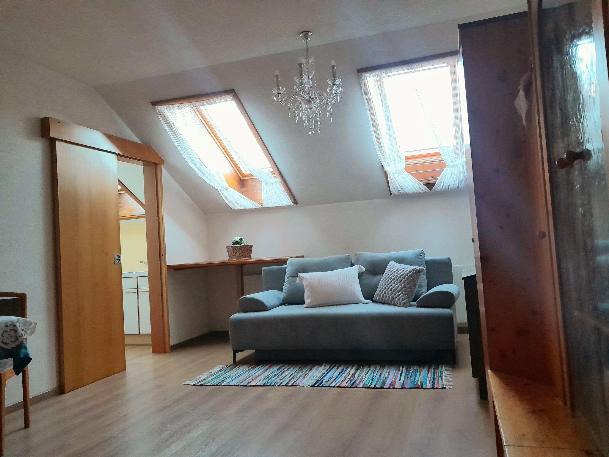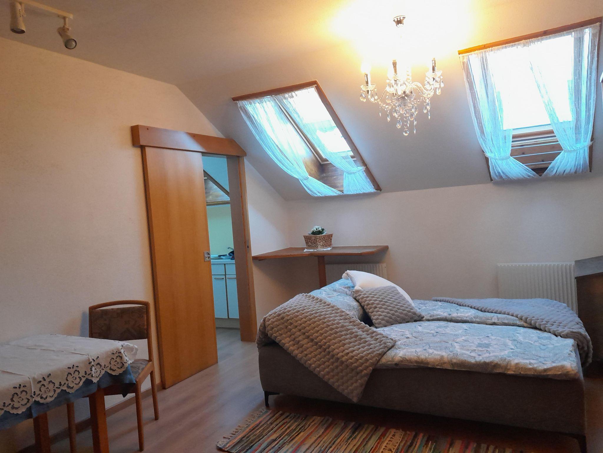 Voll ausgestattete ruhige und gemütliche Mansardenwohnung für 2 bis 3 Personen (3. Bett ist Zustellbett!). Badezimmer mit Dusche und Badewanne. Getrennte Toilette.