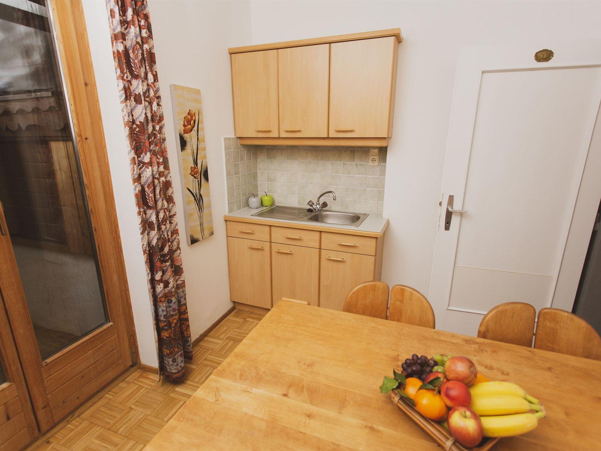 Küche mit Esstisch, Backofen, Herd, Kaffeemaschiene, Wasserkocher