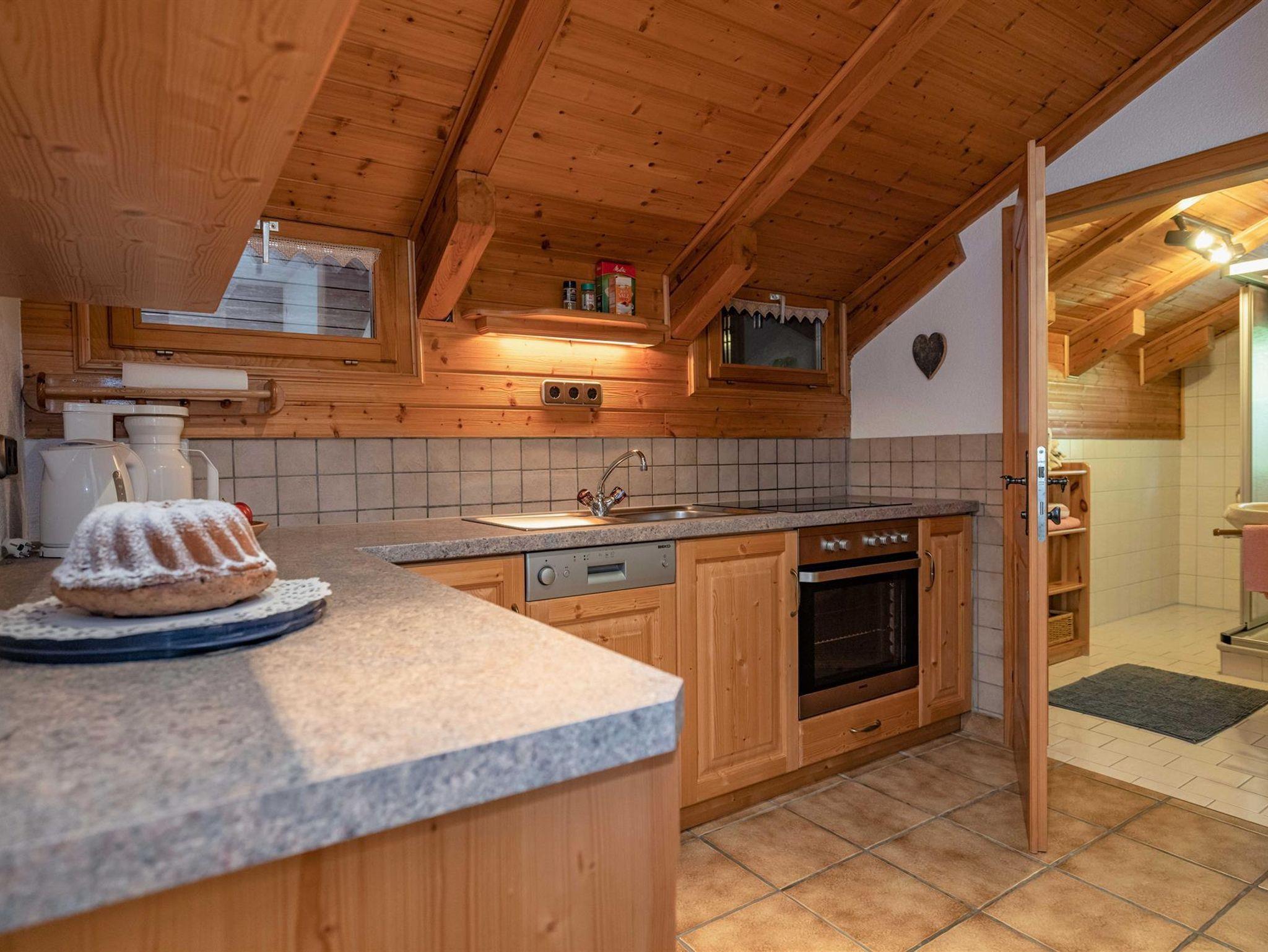 Dusche/WC, Wohnbereich mit Küchenzeile, Holzofen, Balkon.