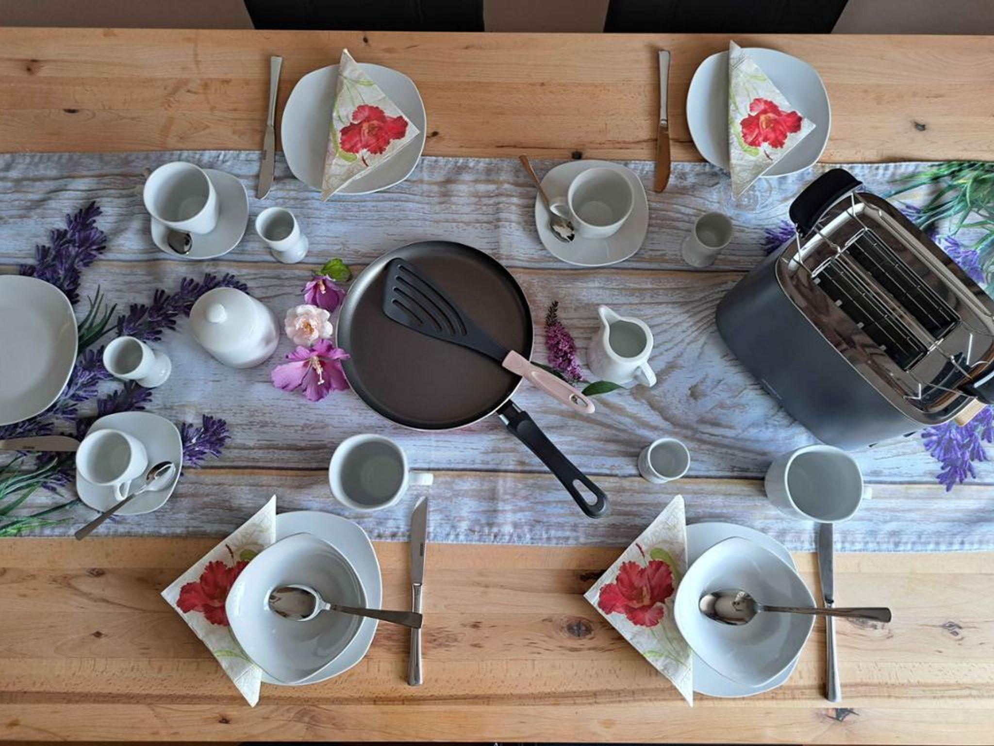 • Vollständig eingerichtete Küche mit Herd, Backrohr, Mikrowelle, Kaffeemaschine (Tassimo), Wasserkocher, Kühlschrank, Geschirrspüler