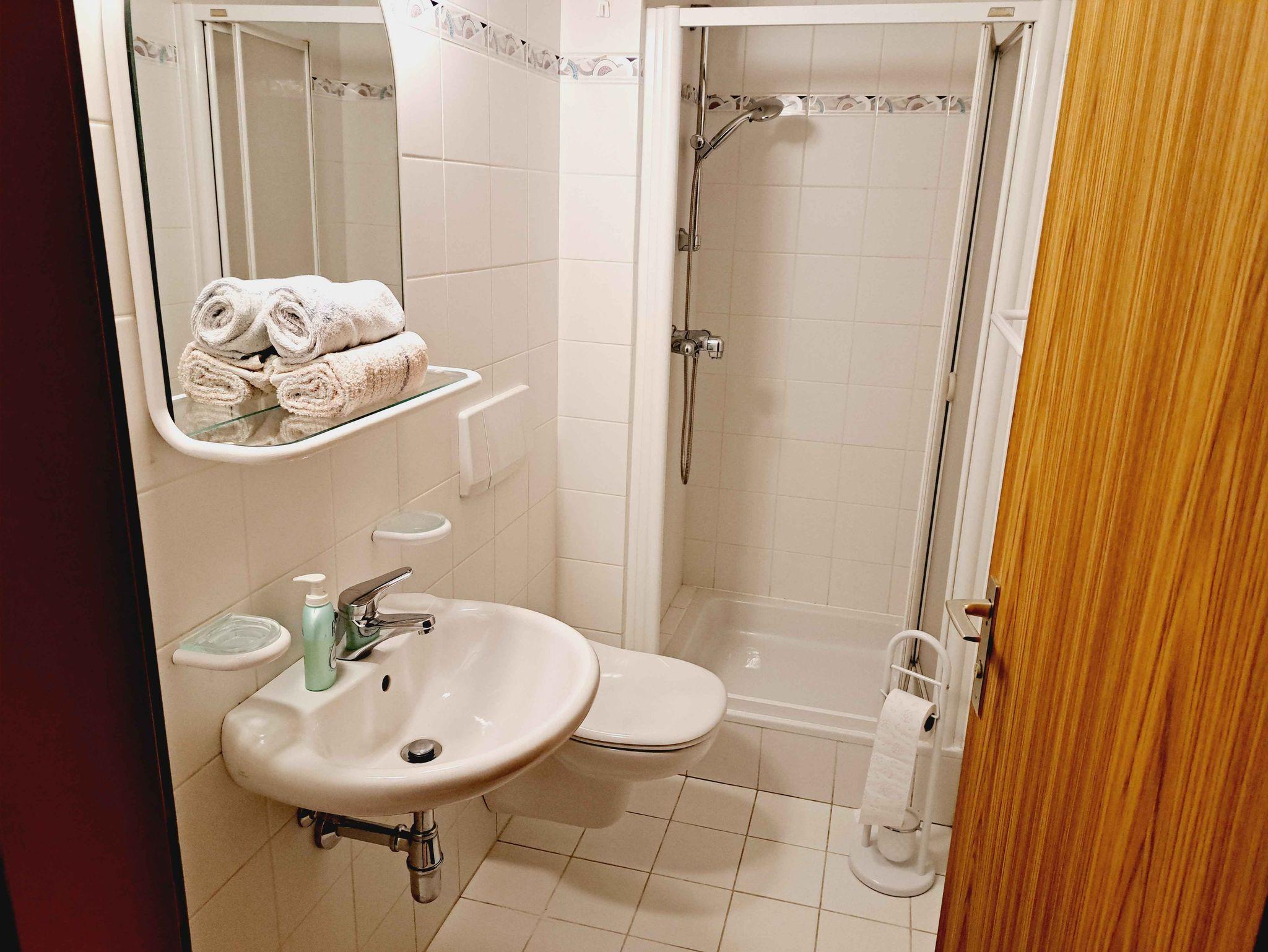 • Badezimmer mit Waschbecken, Dusche und WC
