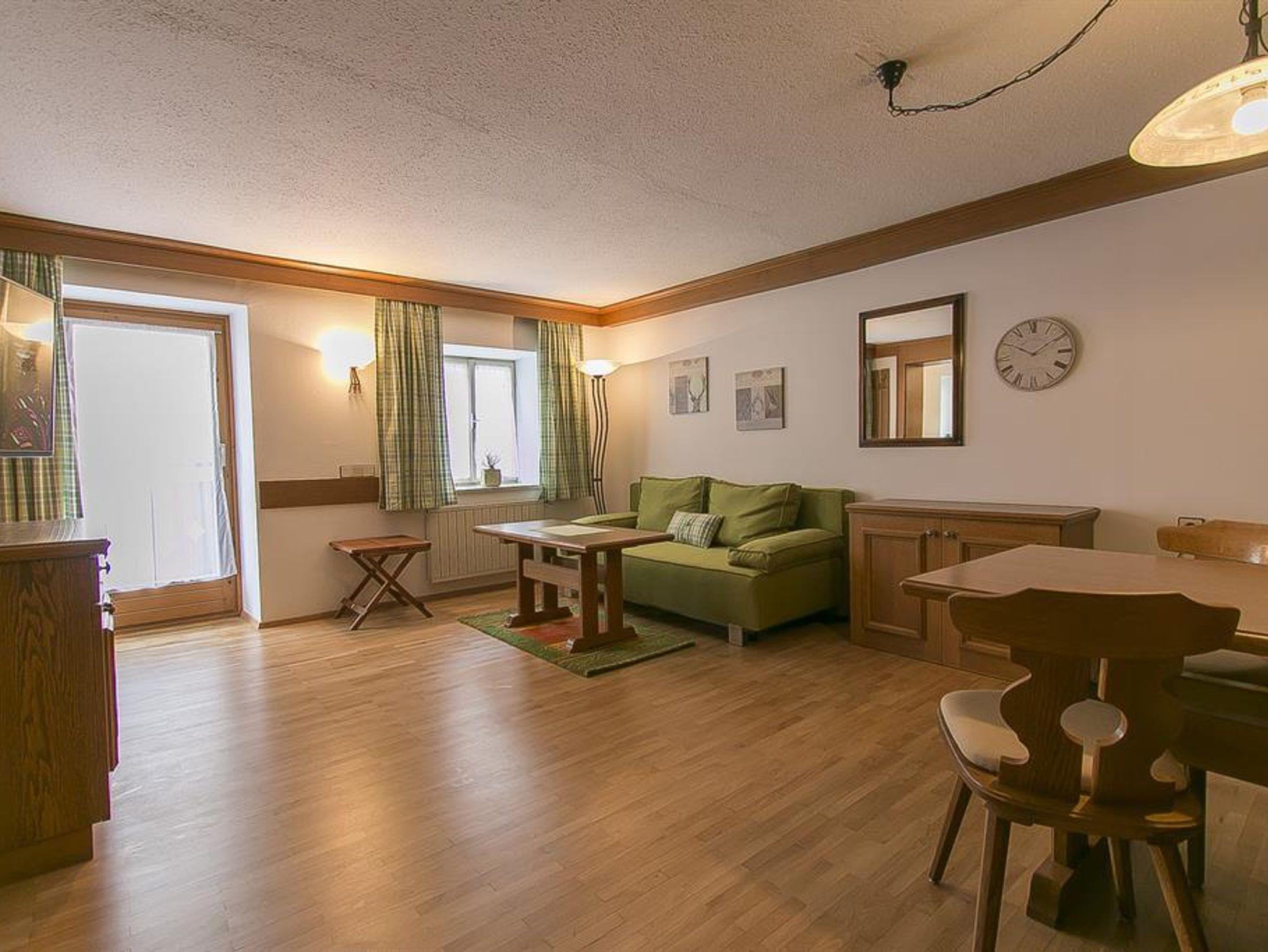 Es befindet sich eine gemütliche Sitzecke im Wohnraum, ein Fernseher und der Zugang auf den sonnigen Balkon.