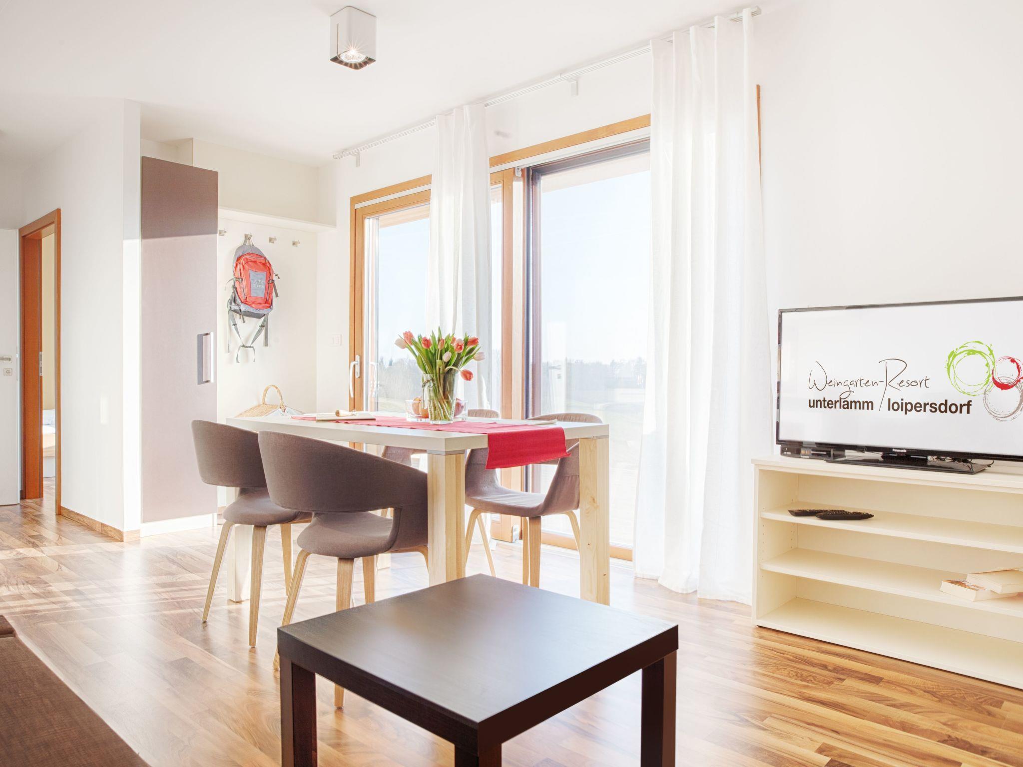 A total of 40 square metres spread over three rooms, the house also offers a separate toilet and a modern bathroom with rain shower, hairdryer, towels and infrared heating. Spa towels and bathrobes are provided in your room for visits to the spa. The bedroom has a cosy double bed with a view over the vineyard. Naturally, the flat is air-conditioned, as the Mediterranean climate in the region means that temperatures can reach 35 degrees in summer. Perfect conditions for a holiday in the vineyard! Large glass fronts and sliding patio doors open from every room onto the private terrace, which is an impressive 50 square metres in size. And offers a wonderful view over the gently sloping vineyards. The vine-covered pergola provides shade, while a seating area and cosy loungers create the perfect conditions for relaxing hours in the midst of nature! The upscale furnishings continue in the fully equipped kitchen, which has a Nespresso machine and an exceptional tea menu as well as everything a holidaymaker's heart desires. Of course, the holiday home also offers satellite TV with ORF reception and free WiFi. Alpine charm meets modern cosiness in the house, warm earthy tones combined with rustic elements and wood create a feel-good atmosphere that invites you to linger. The price includes a breakfast basket, which is delivered every morning.