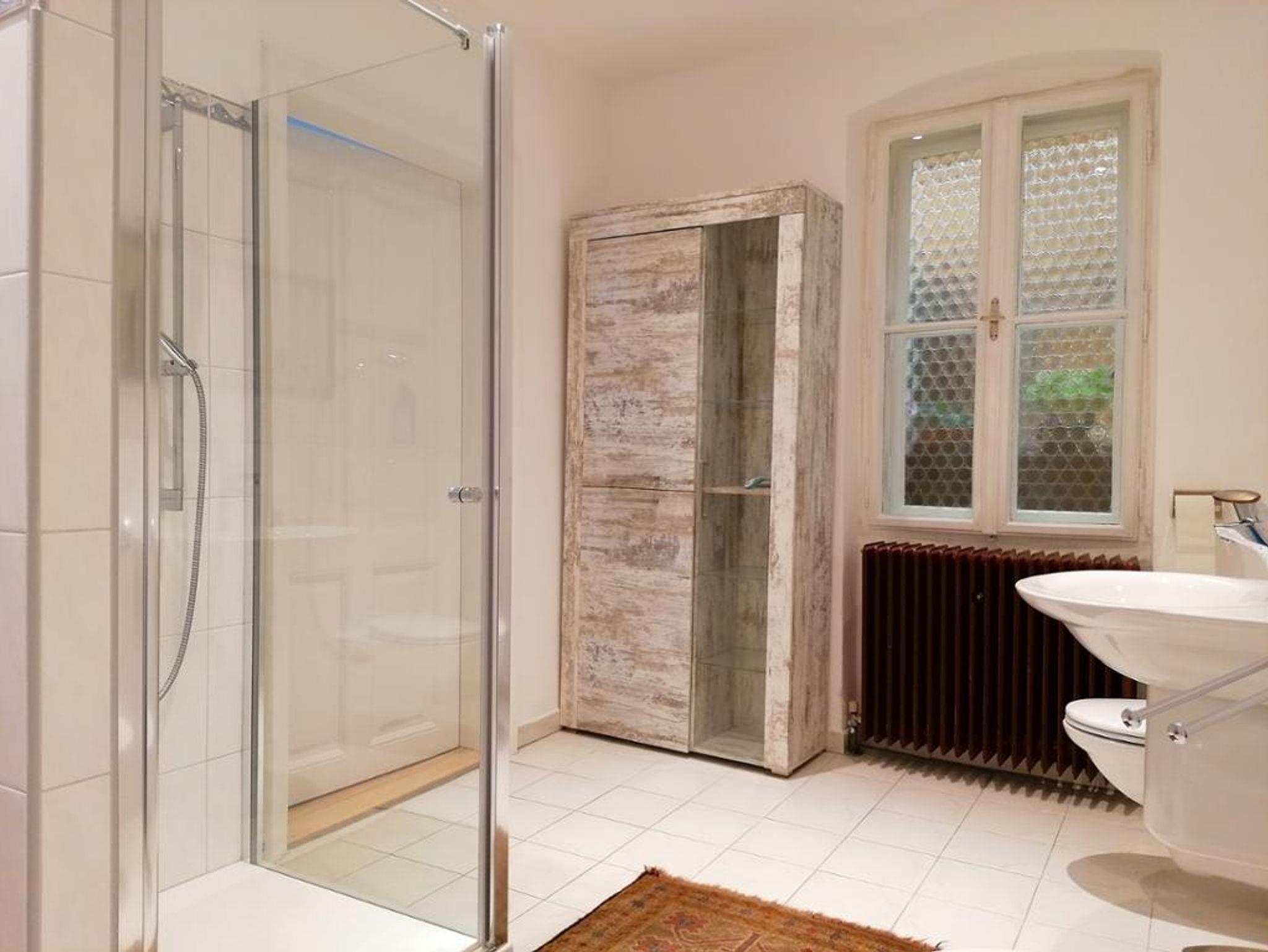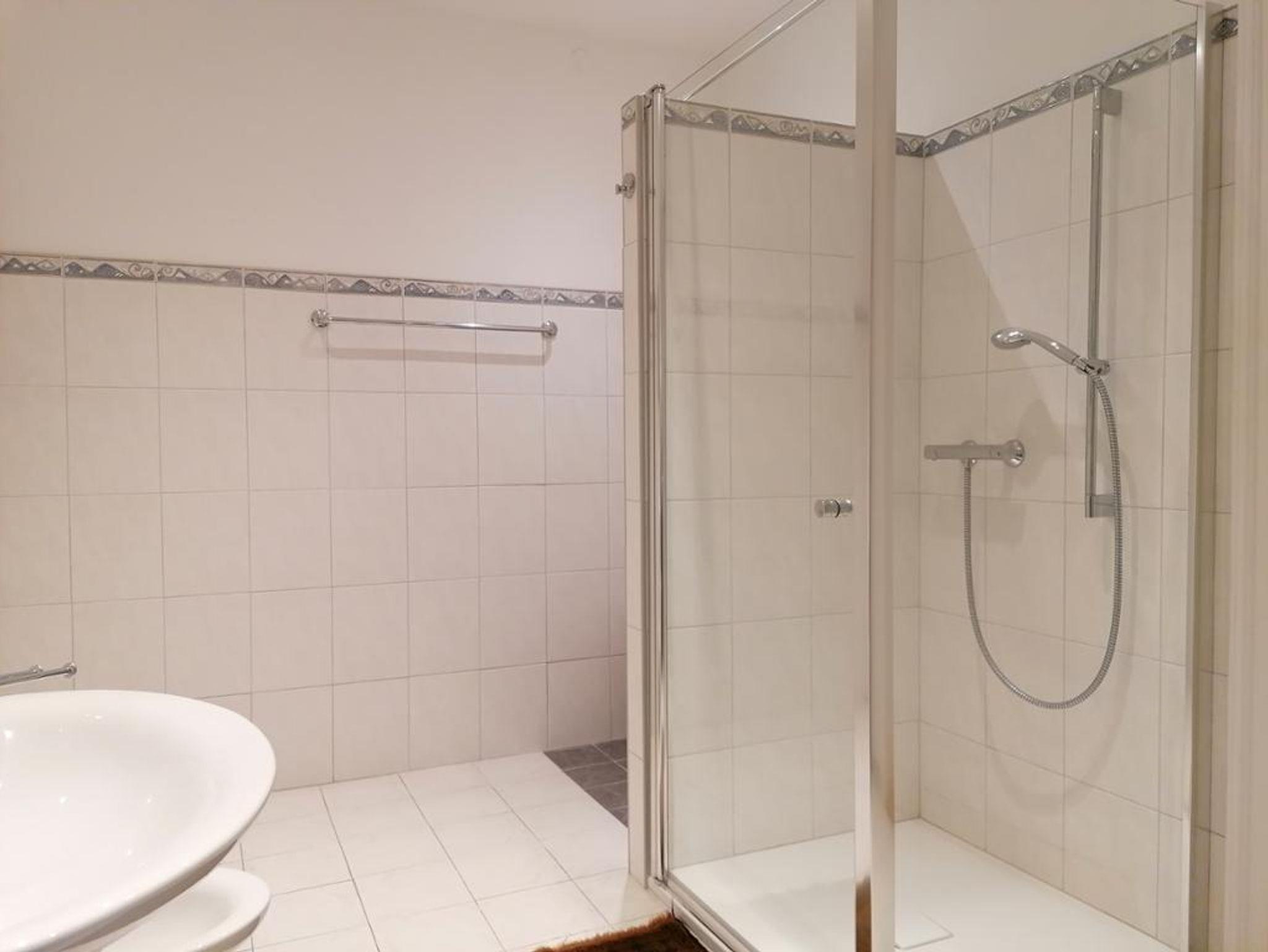 Das geräumige Badezimmer mit ebenerdiger Dusche, WC und Waschbecken rundet das Gesamtbild ab.