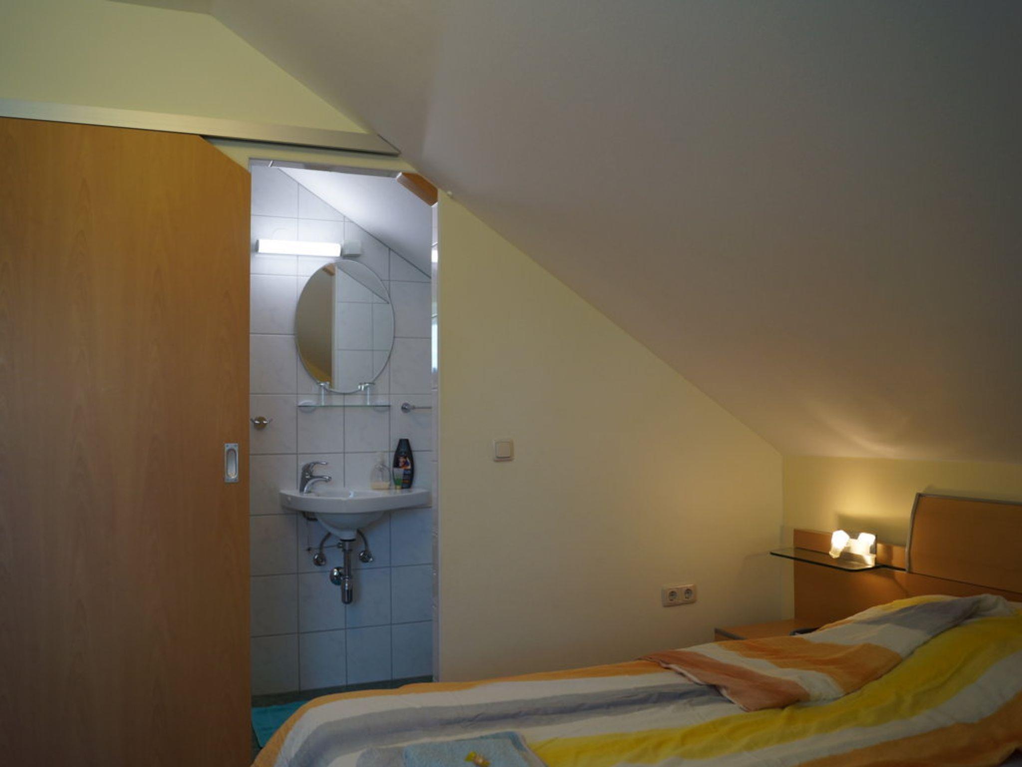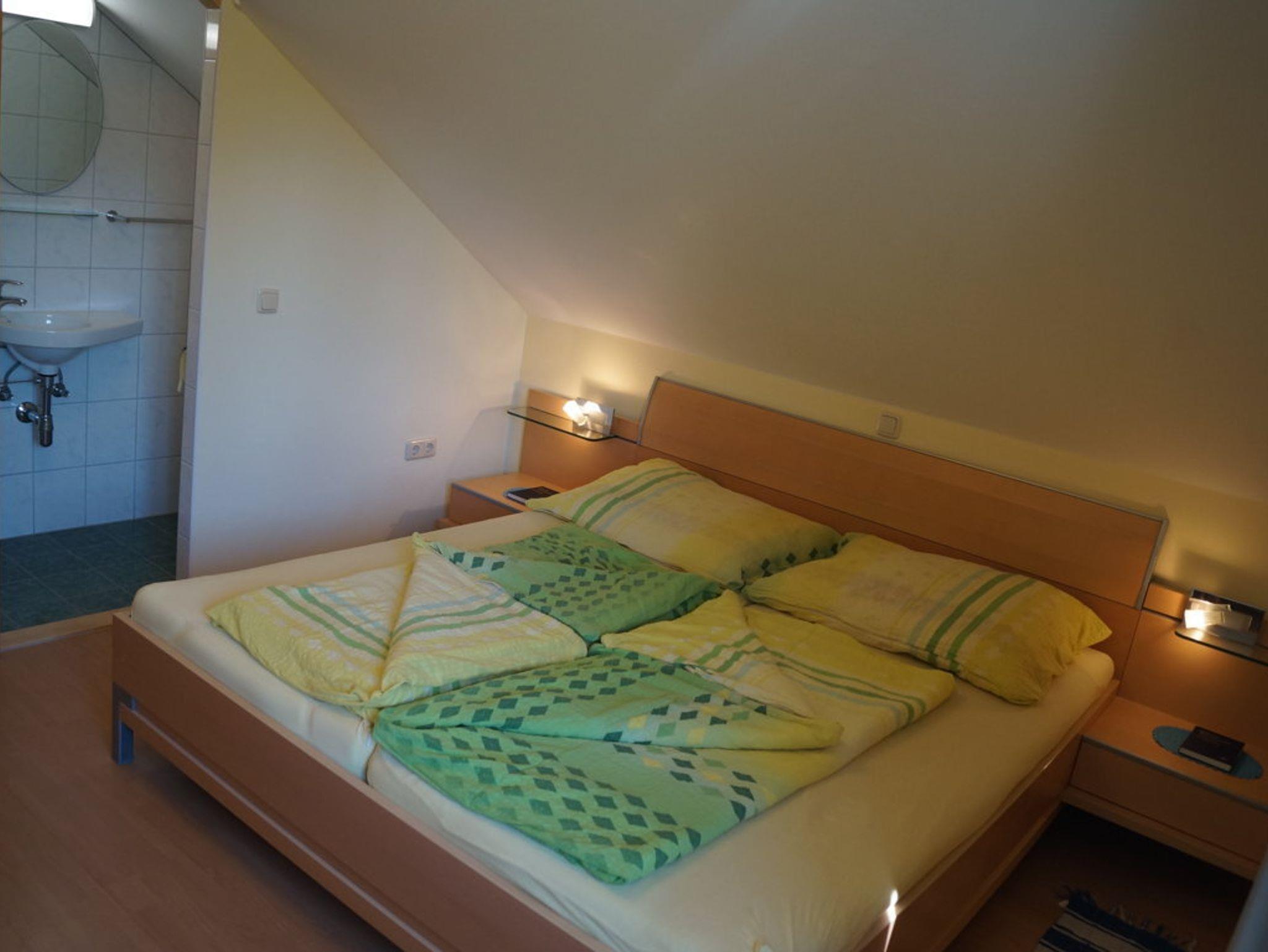 Die Zimmereinrichtung besteht aus einem Schrank, einem Doppel-Bett mit zwei Nachtkästchen, einem kleinen Tisch und zwei Fauteuille-Stühlen. Der Flachbild-TV hängt an der Wand und hat SAT-Receiver - die Abstandsbedienung dazu ist daneben im Hängeordner bei der Gästemappe. Weiters gibt es einen Radio-CD-Player, Ventilator, natürlich W-LAN, Bettvorleger und Fußbodenheizung unter dem Laminatboden. Das Fenster hat einen Rolladen und Fliegengitter. Bettwäsche und Handtücher werden beigestellt.