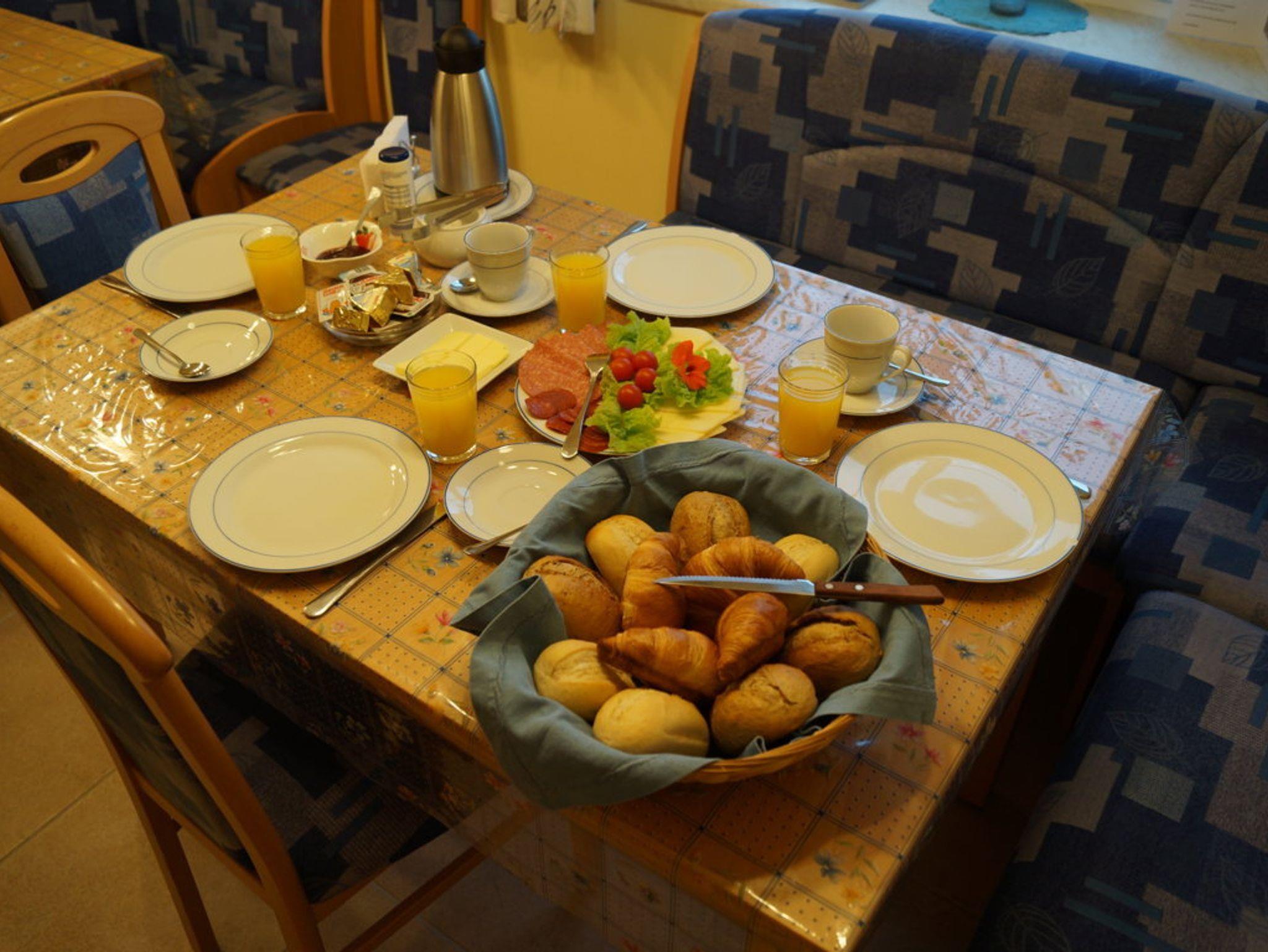 - Verpflegung: auf Wunsch Frühstückservice zwischen 7 und 9 h zu € 9,- pro Person. Brötchen, Tee oder Kaffee, Orangensaft, Butter, selbstgemachte Marmelade, Schokopaste, Käse, Wurst, eventuell Honig oder Gemüsebeilage.