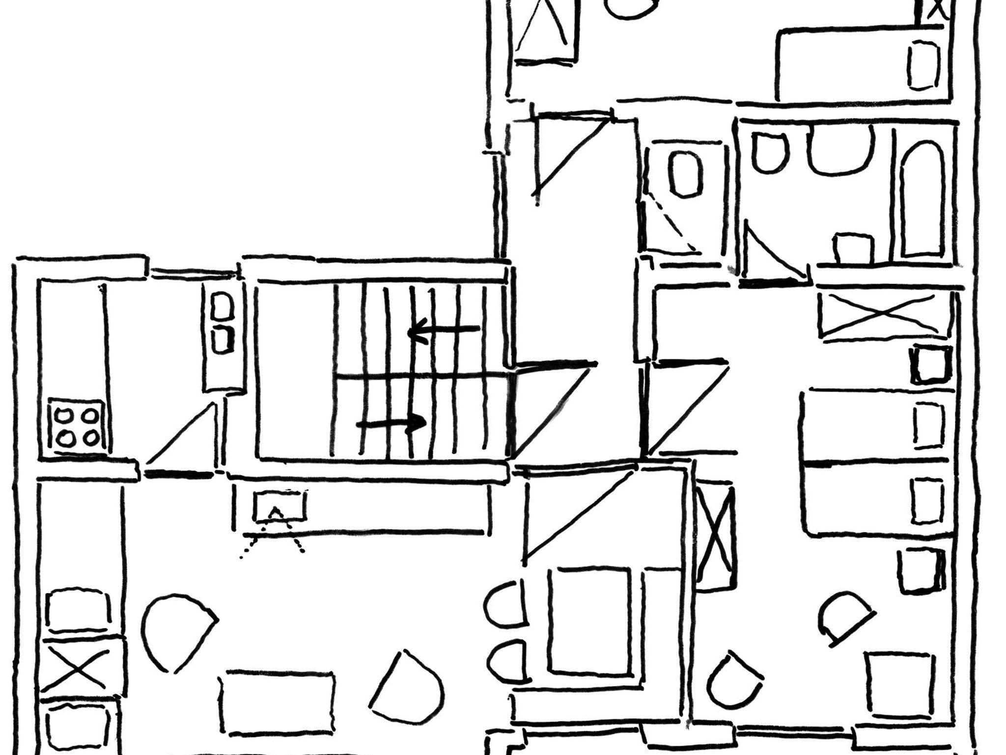 Appartement mit 2 Schlafzimmern (je 2 Betten), Wohnschlafzimmer mit Essecke, Sitzgruppe und 2 Liegen, Küche mit Kühlschrank, Elektroherd mit 3 Kochplatten und Backrohr, Bad und WC und ein zweites WC extra, Vorraum und großer überdachter Balkon