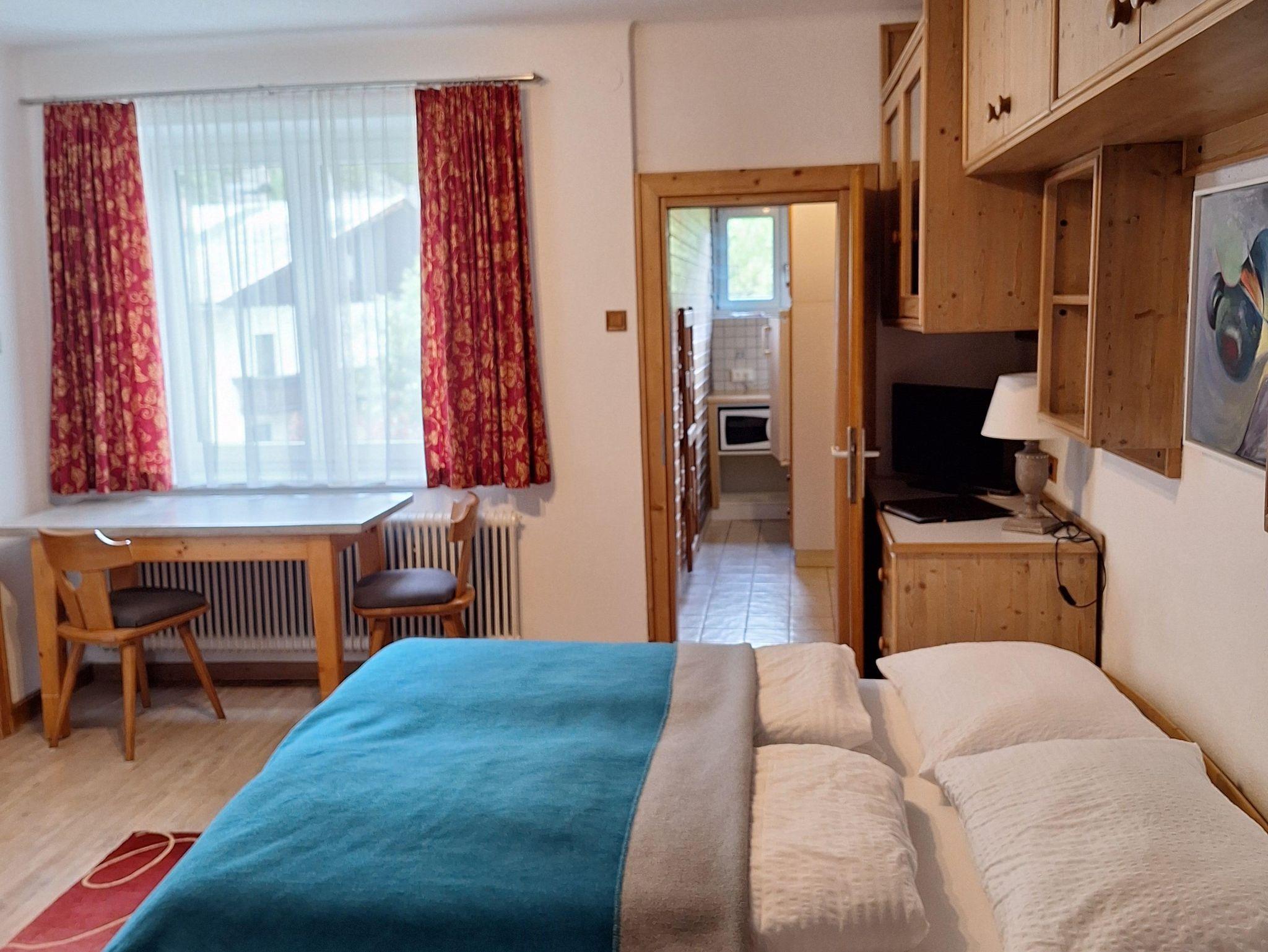 Studio mit 20m², bestehend aus einem Wohn-Schlaf-Essraum mit Doppelbett, kleiner, voll ausgestatteter Küche (4-Platten-Herd mit Backofen, Kühlschrank, Wasserkocher, Kaffeemaschine, Toaster, Microwelle) sowie DU/WC.