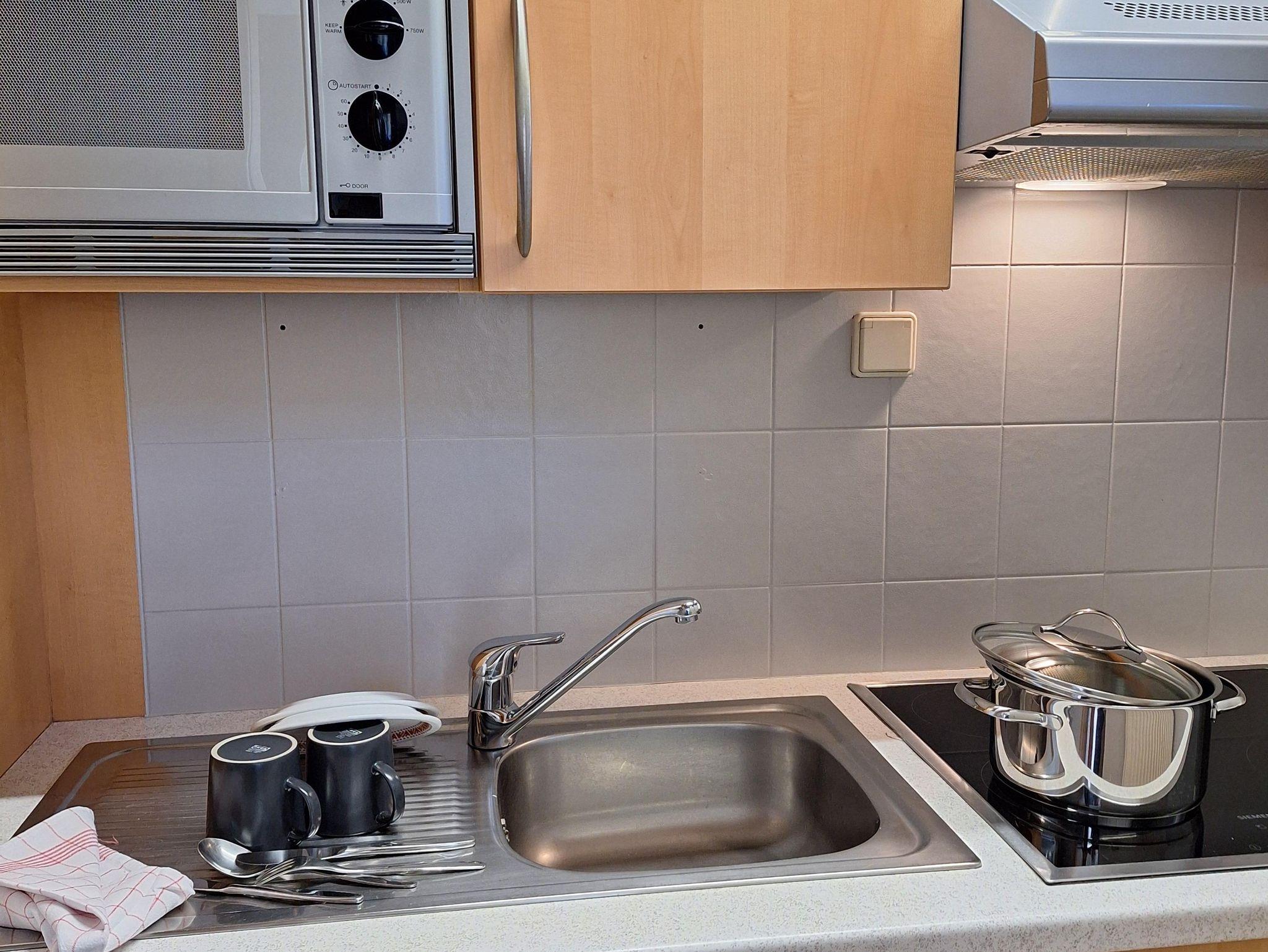 1 Doppelzimmer/DU/WC, ca. 8m² Balkon, Wohn-Esszimmer mit Couchbett, Esstisch und kleiner Küche, voll ausgestattet (Microwelle, Geschirrspüler, Kaffeemaschine, Wasserkocher, Toaster, 4-Platten-Elektroherd, Kühlschrank, Dunstabzug)