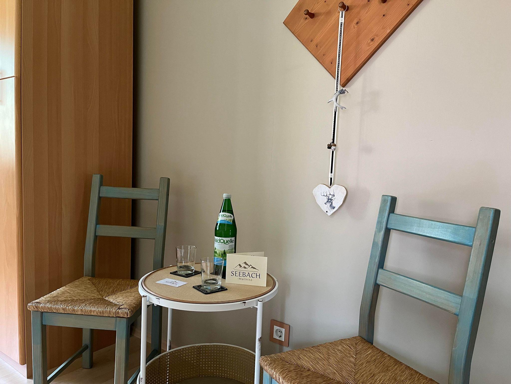 Das Zweibettzimmer Johann und das Doppelzimmer Maria sind beide in der ersten Etage mit Zugang zum großen überdachten Eckbalkon, gemütlich ausgestattet mit Vintage Sitzgruppe und Schaukelstühlen.