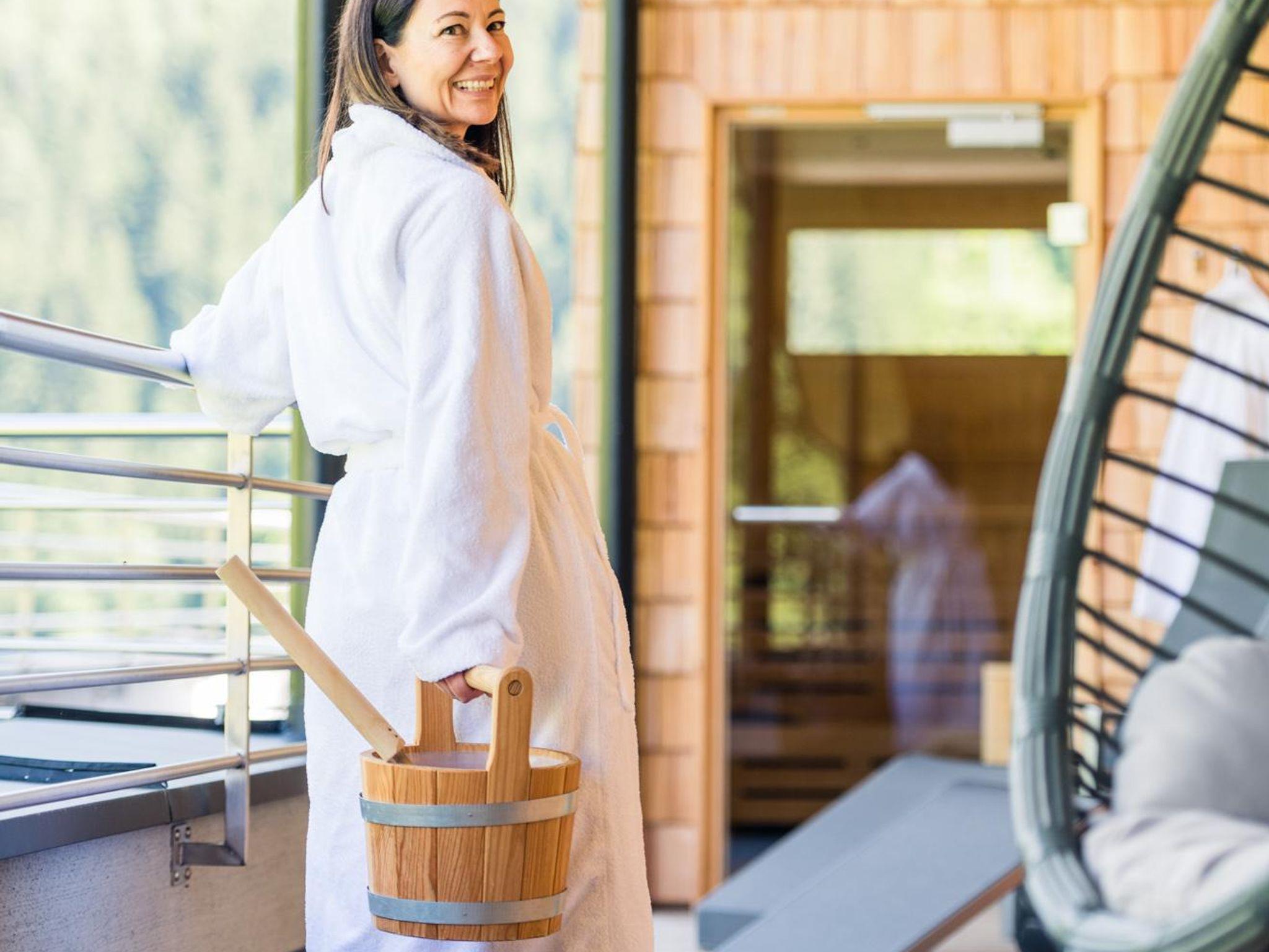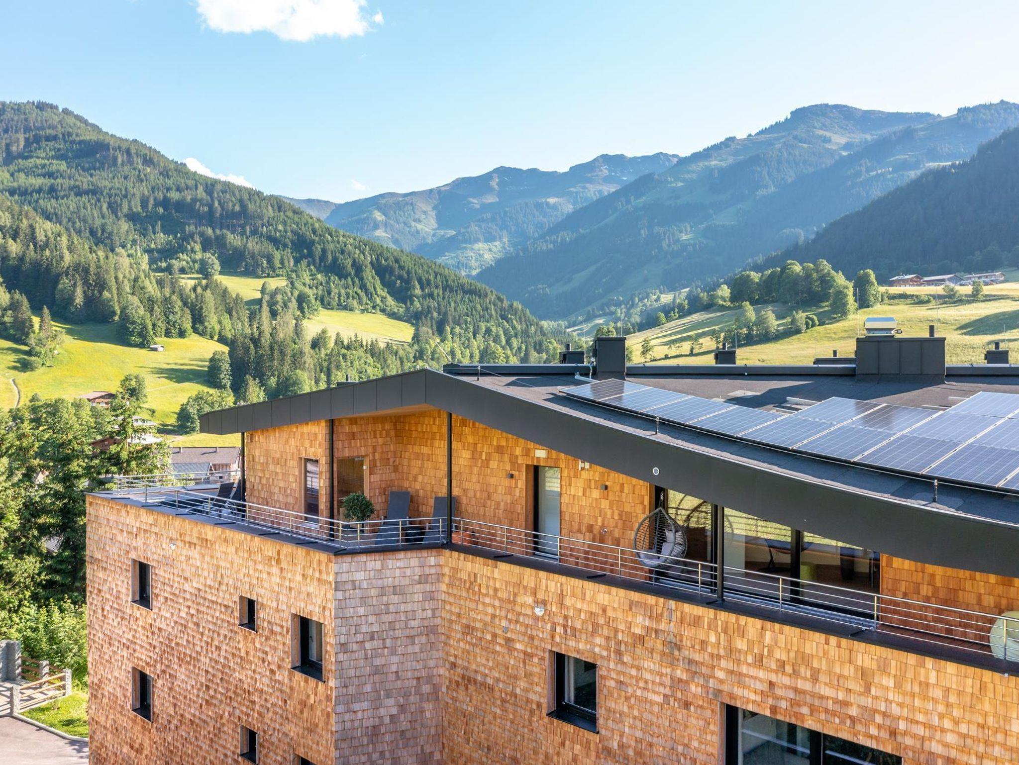 Der Wellnessbereich am Dach mit Panormasauna, Ruheliegen und Sonnenterrasse verspricht erholsame Momente.