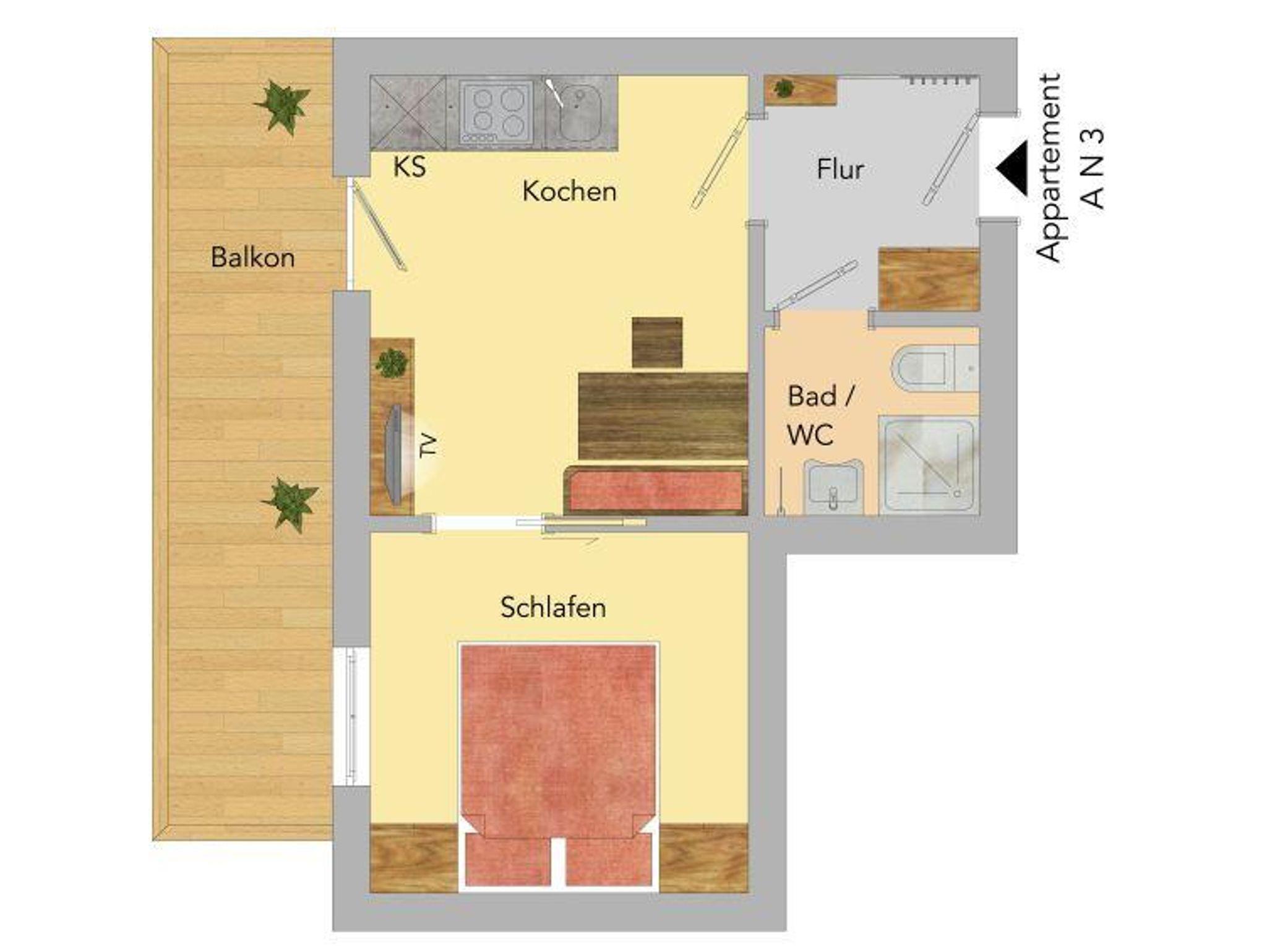 Unser Appartement N3 bietet die ideale Möglichkeit einen unvergesslichen Urlaub zu zweit zu verbringen. Es bietet die perfekte Größe für zwei Personen - 1 geräumiges, gemütliches Schlafzimmer, ein sehr einladender Wohnraum mit Couch und eine Sitzecke, die dazu einlädt dort gemeinsam Zeit zu verbringen. Weiter bietet das Appartement einen Küchenblock, der einem/r alles bietet, das benötigt wird.Das Schlafzimmer ist separat, also getrennt vom Wohnbereich.