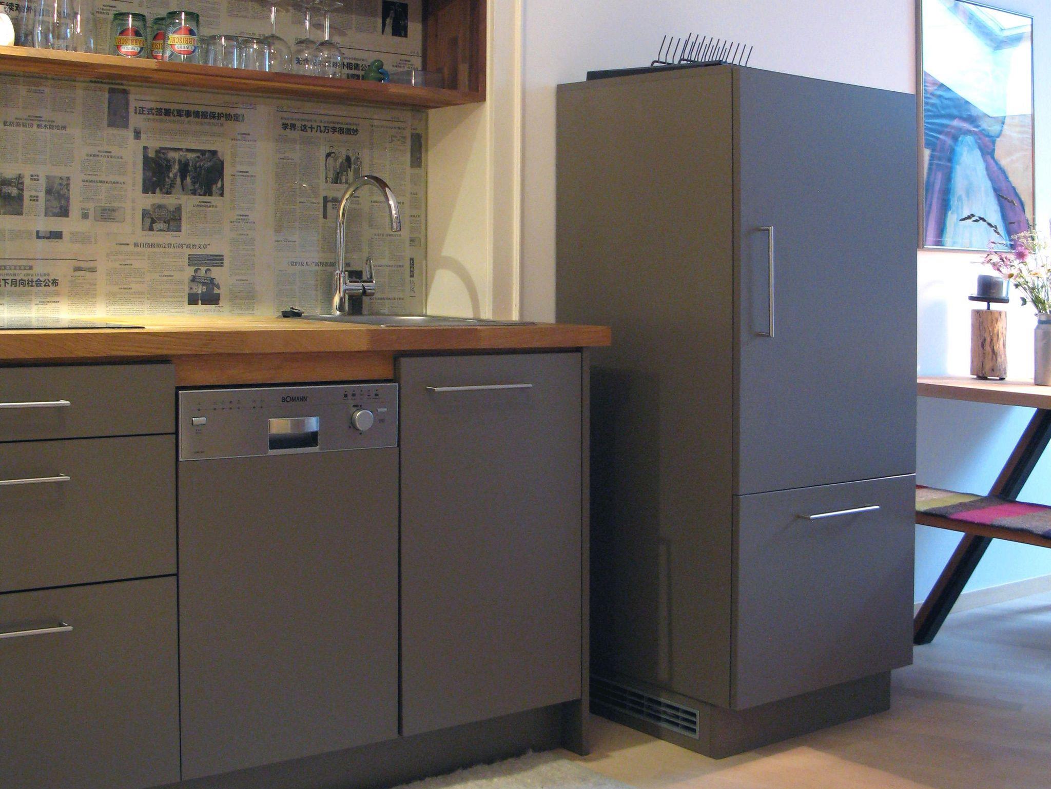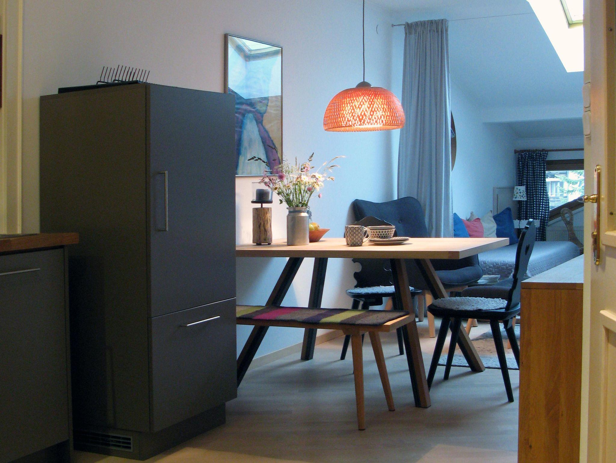 Wohn-Schlafraum mit Küchenzeile (2 Herdplatten, Kühlschrank, Geschirrspüler, Wasserkocher und Kaffeemaschine), Esstisch, Bank und Stühle, Lehnsessel und Doppelbett.