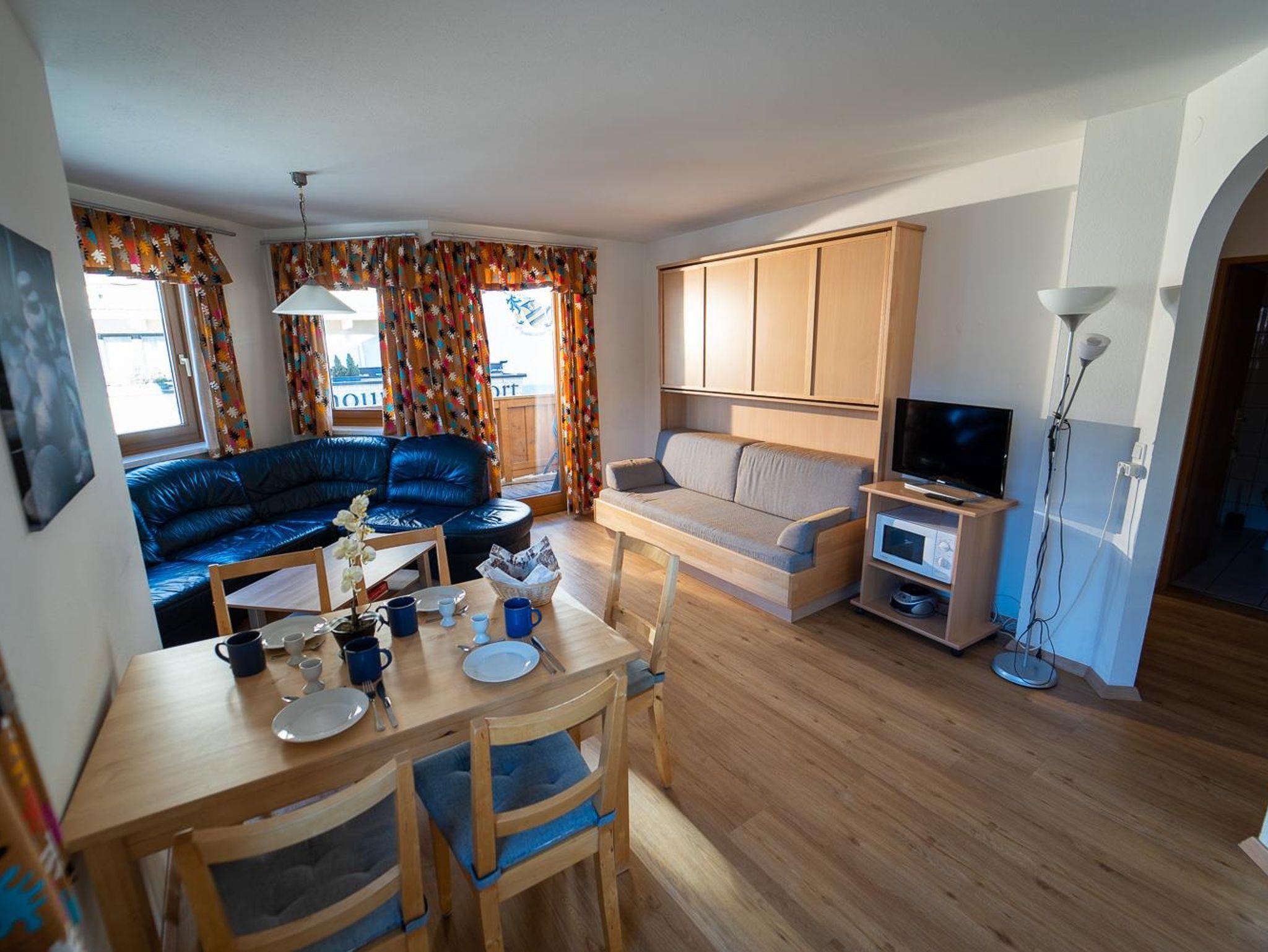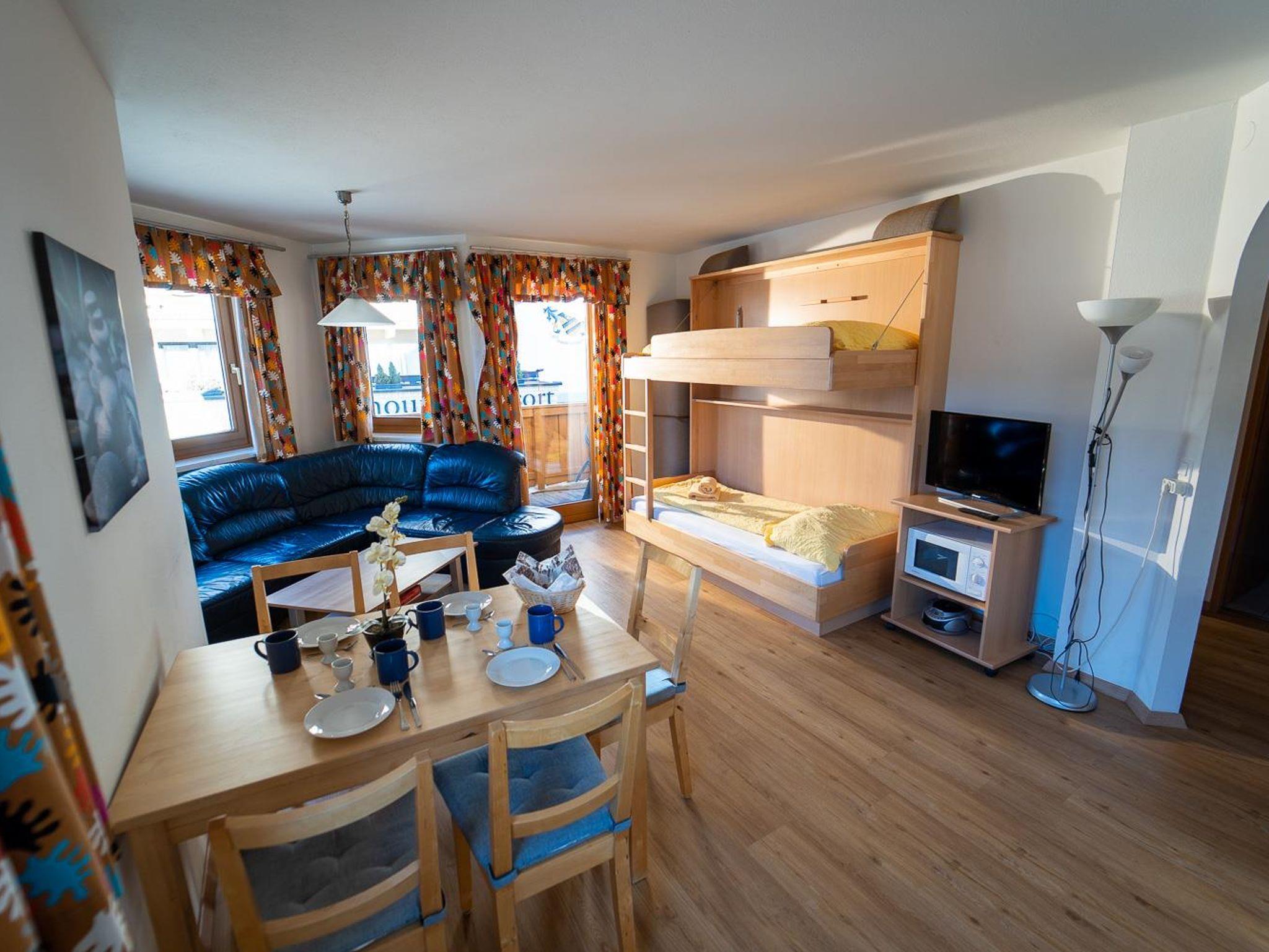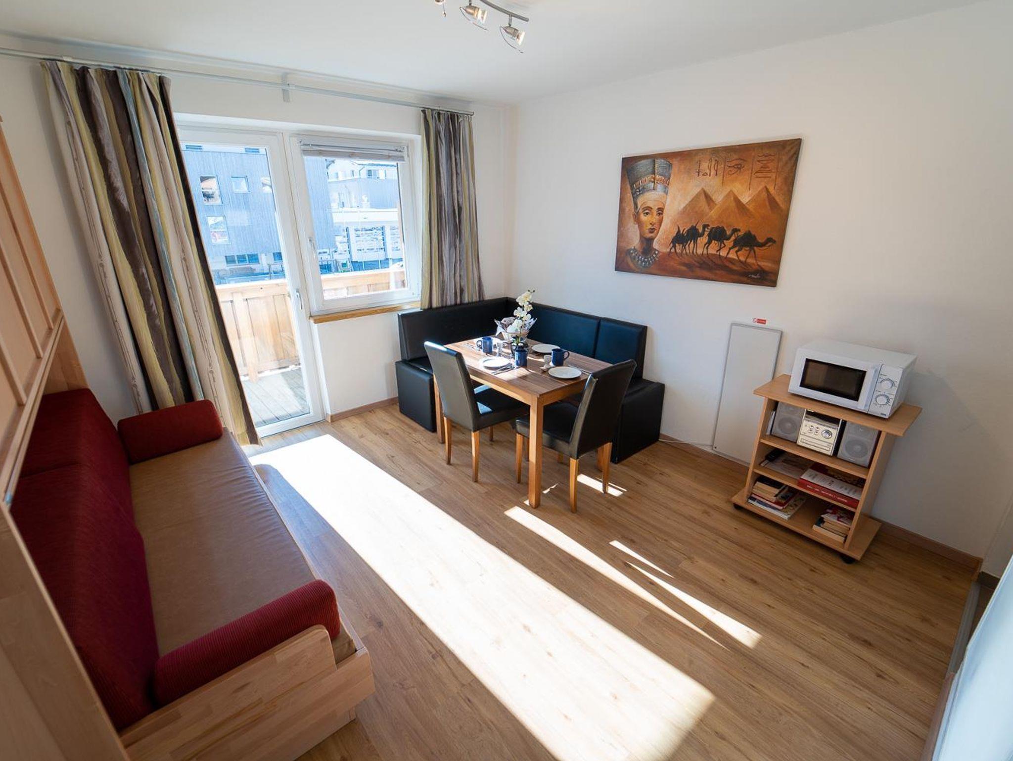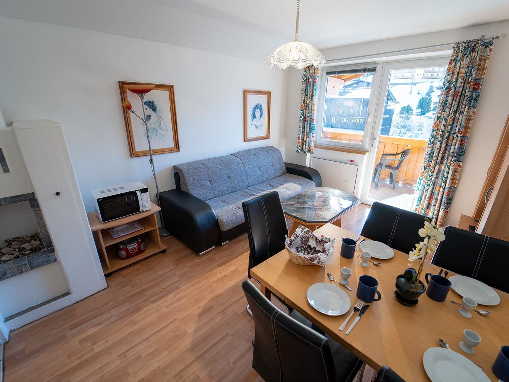. alle Komfort Apartments verfügen über einen Balkon entweder zur sonnigen süd-west Seite oder zur ruhigen Dorfseite mit Bergpanorama'
