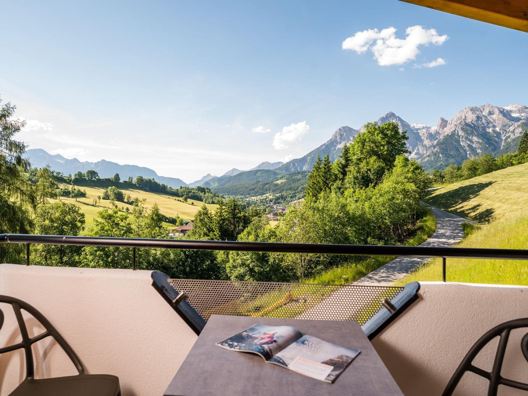Der Wellnessbereich am Dach mit Panormasauna, Ruheliegen und Sonnenterrasse verspricht erholsame Momente.