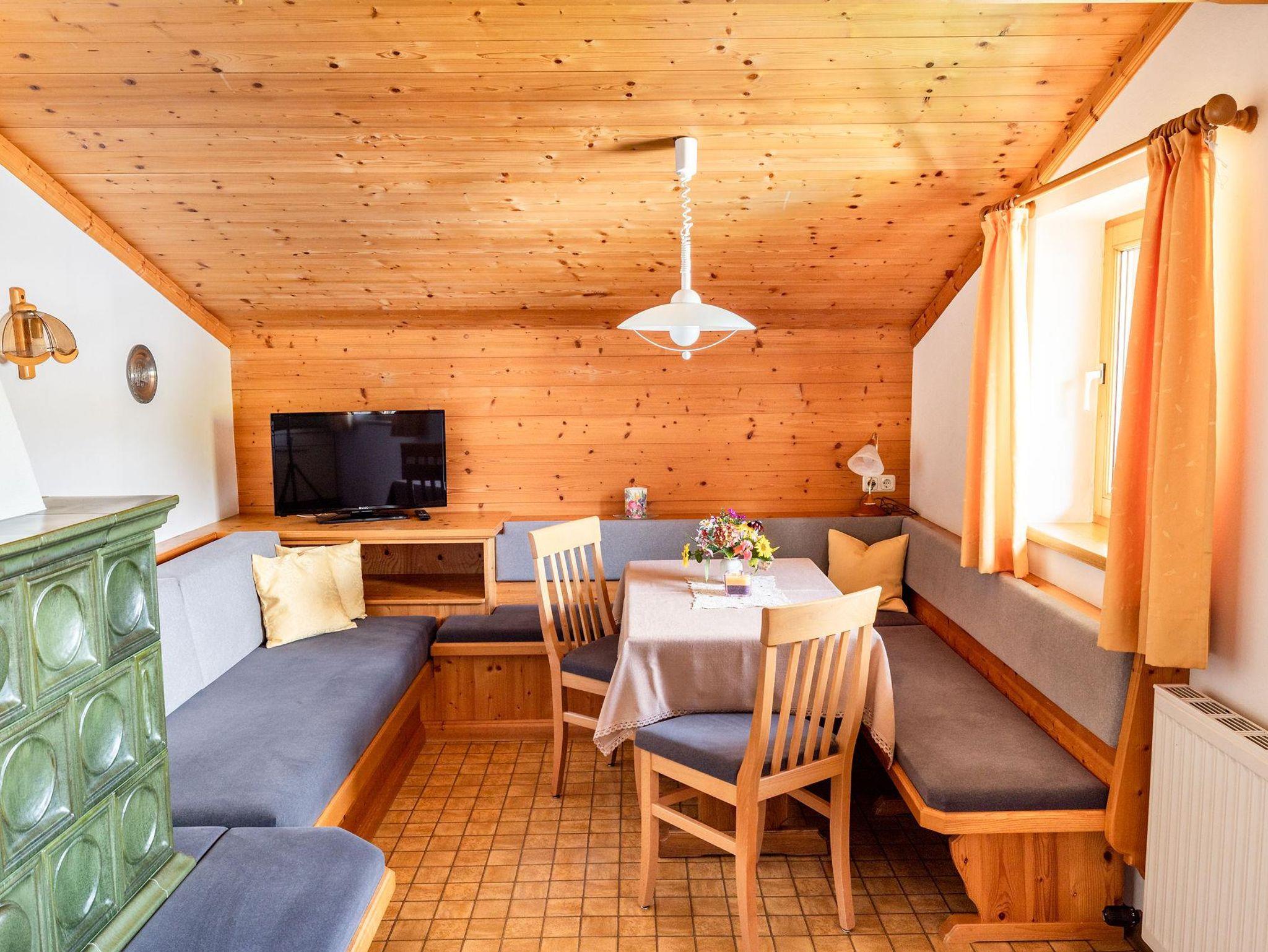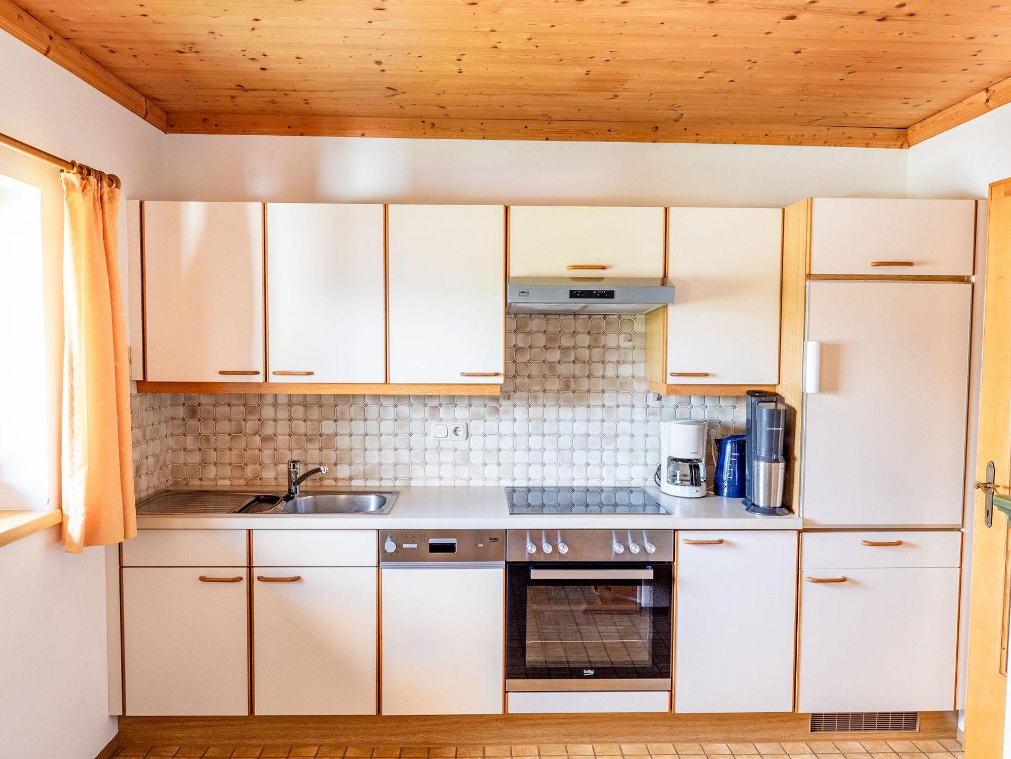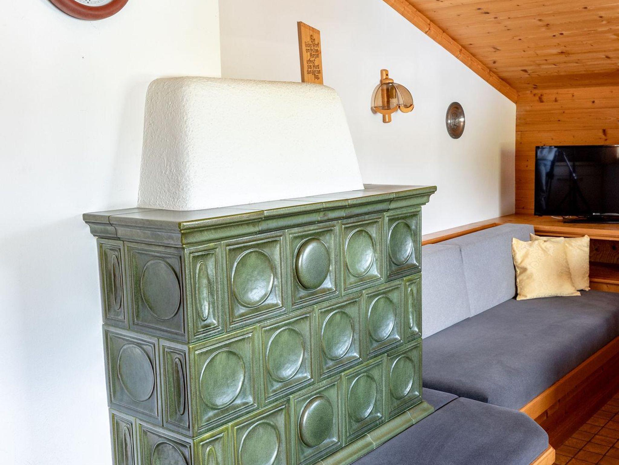 Der Wohnraum verfügt über einen modernen Küchenblock mit Geschirrspüler sowie eine gemütliche Essecke. Ein Kachelofen und eine bequeme Couch sorgen für wohnliche Atmosphäre.
