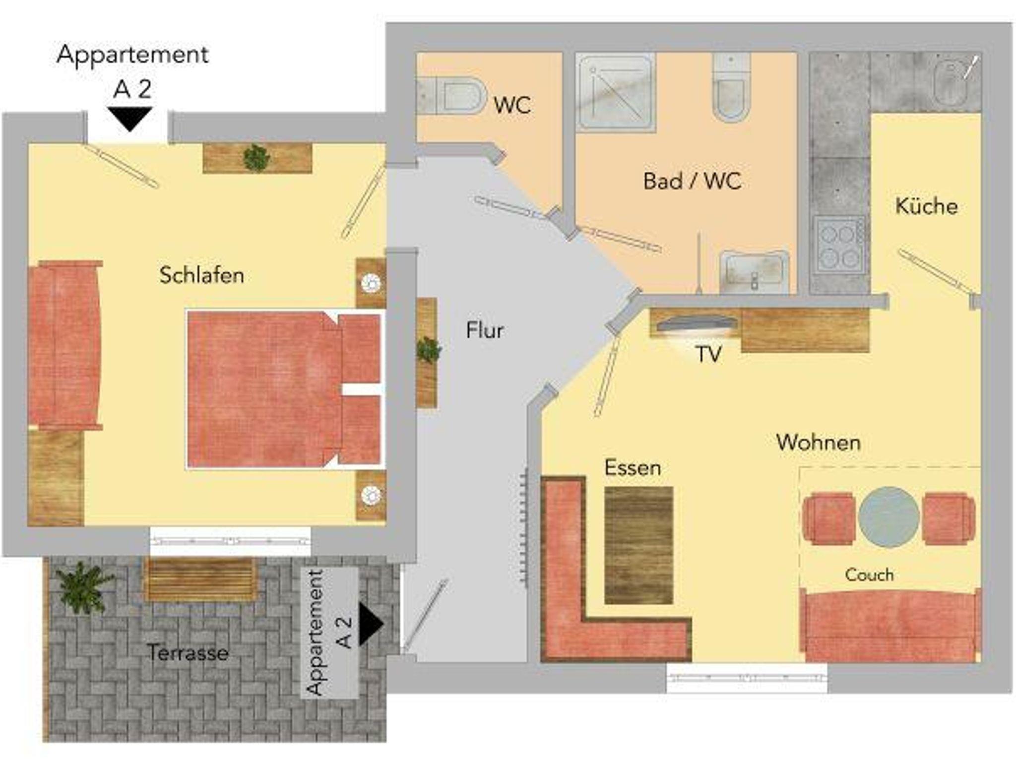 Unser Appartement A2 ist ein schönes, geräumiges Appartement im Erdgeschoss (also ohne Treppensteigen) mit einer tollen Terrasse.