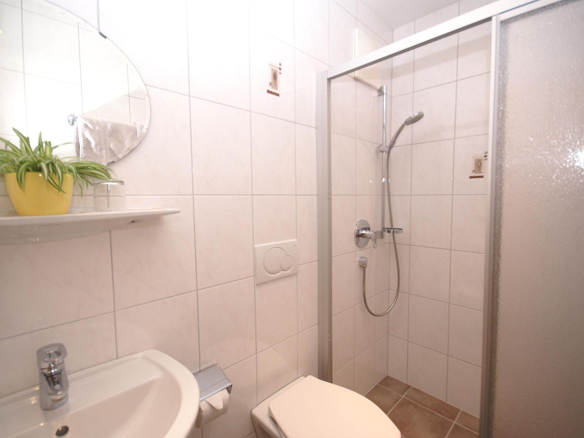 Bad mit Dusche, WC, Waschbecken und Haarfön, Dusch und Handtücher sind vorhanden.