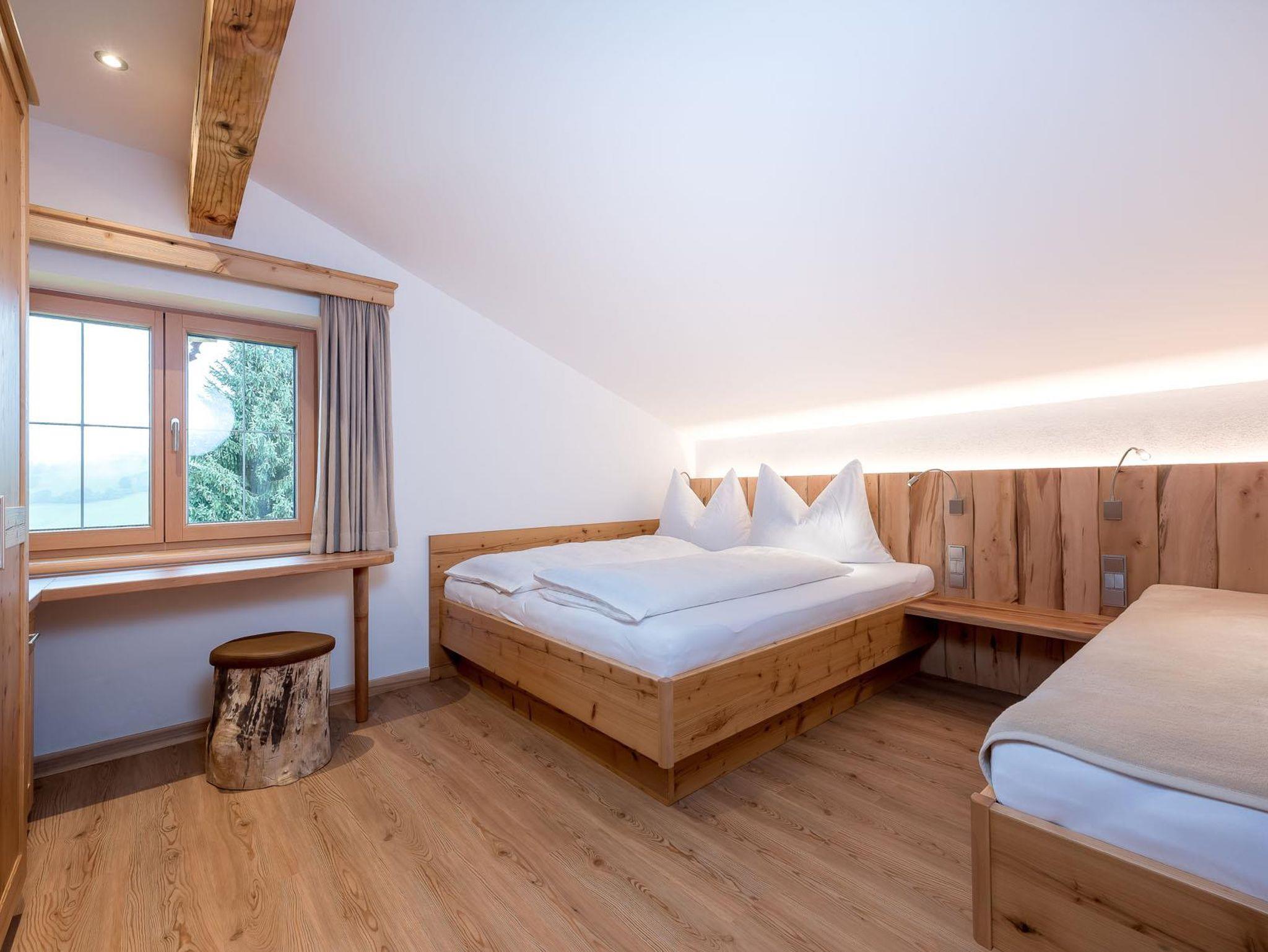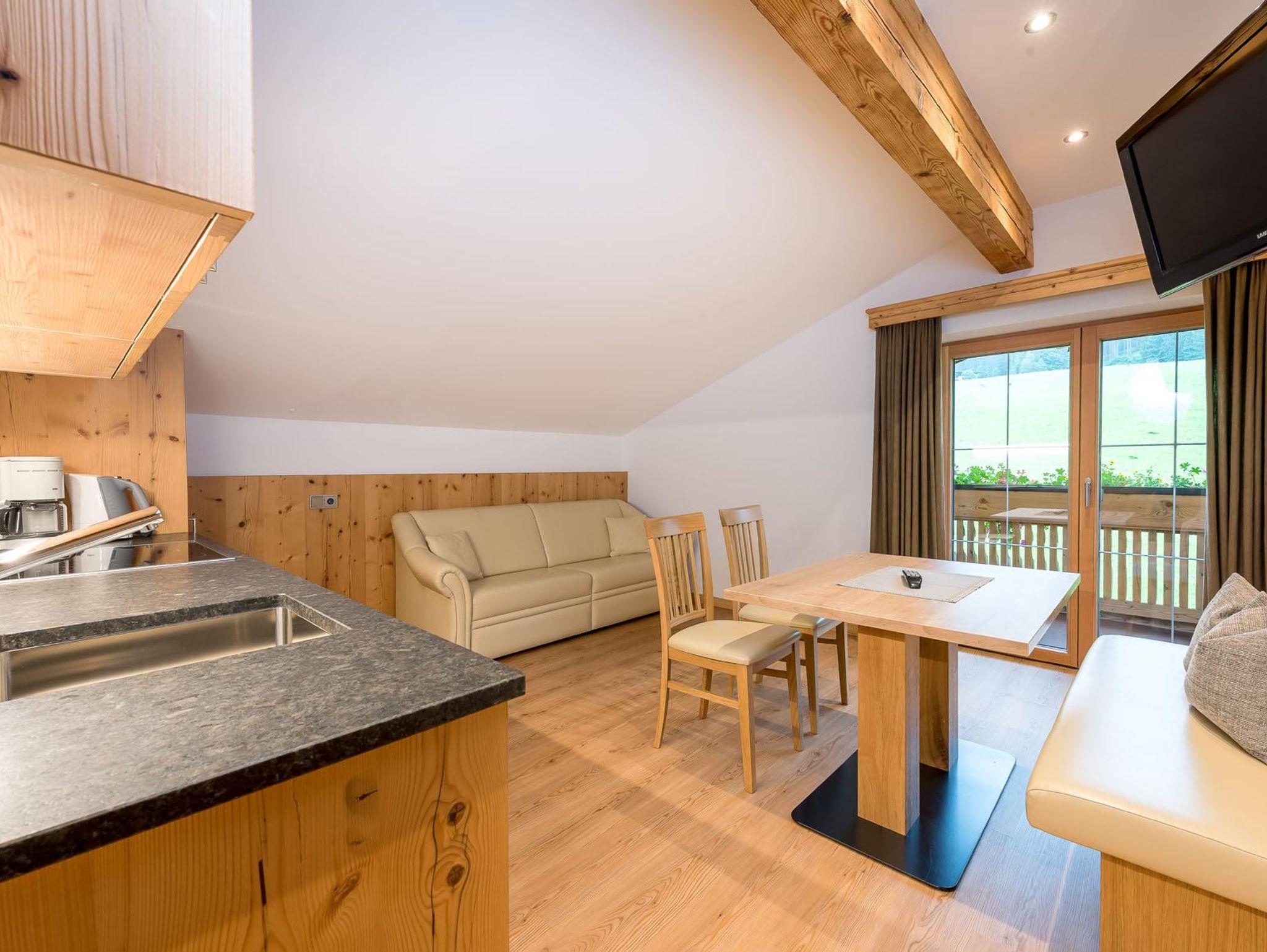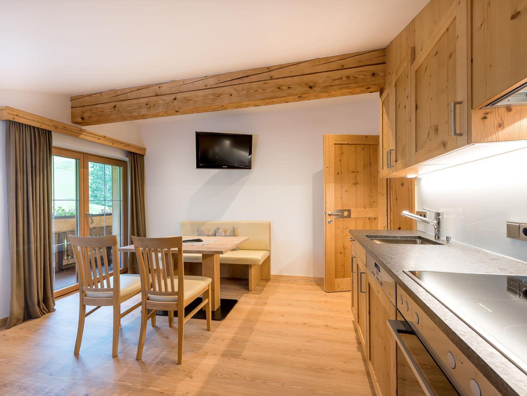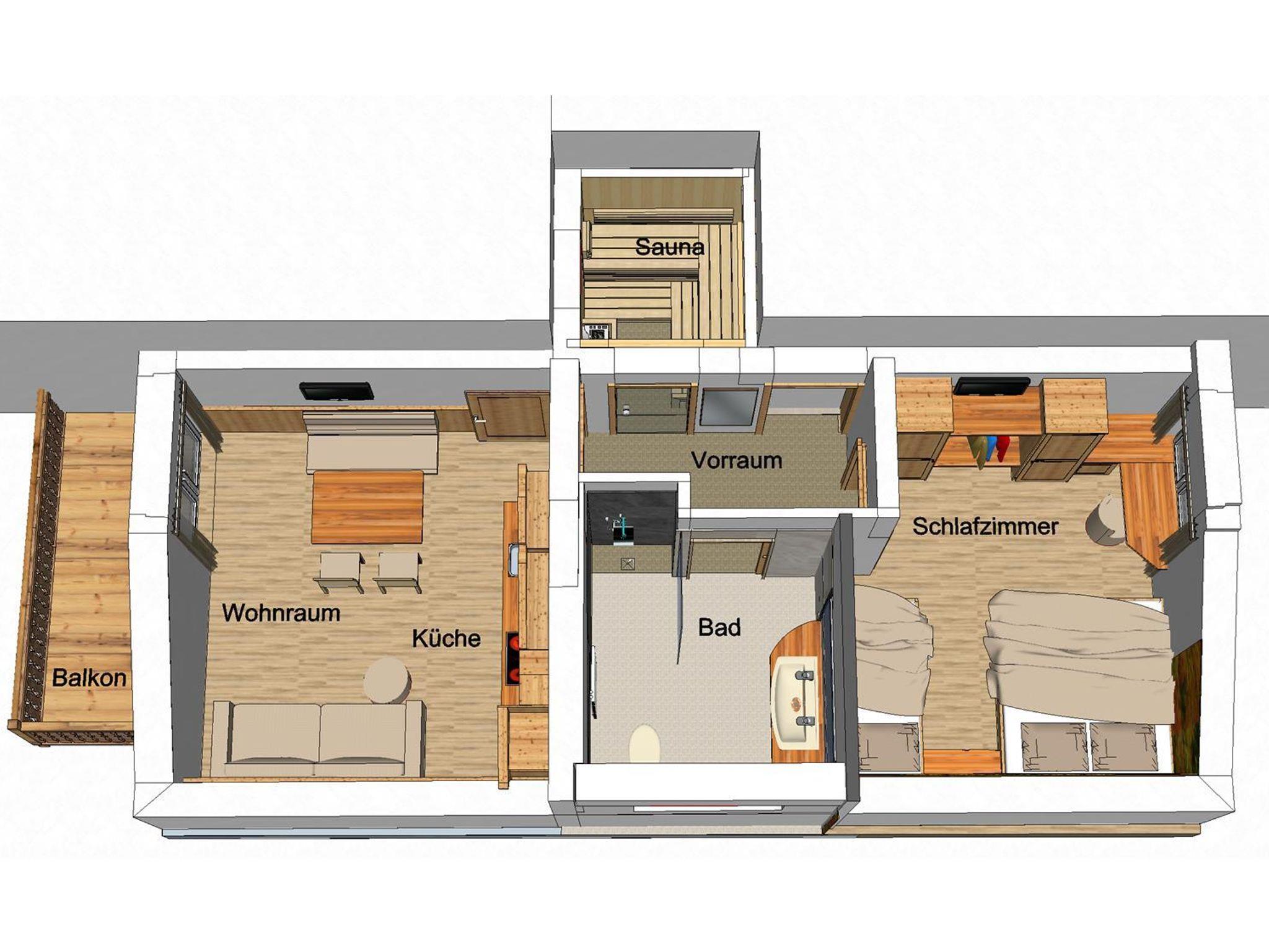 Unser neues, mit ausschließlich heimischen Holz (in Birne und Kirsche) eingerichtetes Appartement verfügt über ein Schlafzimmer mit Doppelbett und Einzelbett, gemütliche Wohnküche mit Ausziehcouch für 2 Personen, Vorraum, geräumiges Badezimmer mit Dusche/WC, Regenbrause und Haarföhn, Kabel-TV für Schlafzimmer und Wohnküche, eigene finnische Sauna kombiniert mít Infrarot - Tiefenstrahler, Balkon südseitig. Die Küche ist ausgestattet mit E-Herd inkl. Backofen, Geschirrspüler, Kaffeemaschine, Sodastream und Wasserkocher. Bettwäsche, Bade- und Handtücher, Saunatücher, Bademäntel und Geschirrtücher sind vorhanden!
