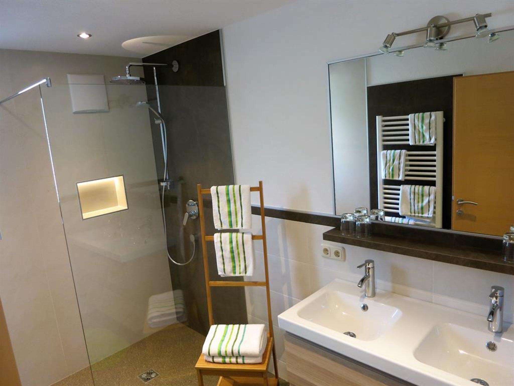 • Neues modernes Bad mit begehbarer Dusche und Doppelwaschtisch, Handtuchtrockner