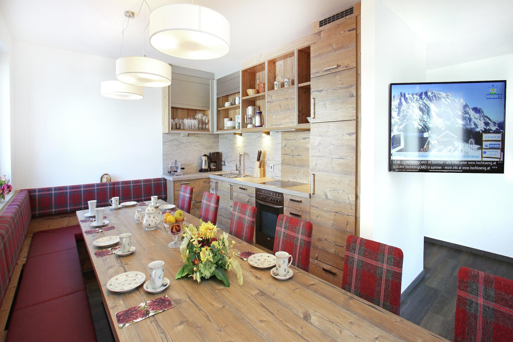 Dette smukke fritliggende sommerhus ligger i bydelen Hintermoos, en del af den kendte og charmerende landsby Maria Alm og skisportsstedet Hochkönig. Din feriehjem, som du vil have helt til dig selv, ligger på første sal og har ikke færre end 3 soveværelser, 2 badeværelser og en smuk stue med åbent køkken, hvor hele din gruppe kan nyde måltider sammen. Fra den solbeskinnede altan har du en smuk udsigt over de omkringliggende bjerge. I foråret og sommeren er dette feriehus omgivet af store grønne enge, og du kan virkelig nyde den smukke udsigt fra sommerhuset. Maria Alm tilbyder mange muligheder og er meget populært i løbet af disse årstider. Takket være sin centrale beliggenhed er Maria Alm en ideel base for mange dagsture til Salzburg eller Zell am See, Kaprun-reservoiret, Grossglockner, Burg Hohen Werfen og "Ice of the Giants World".