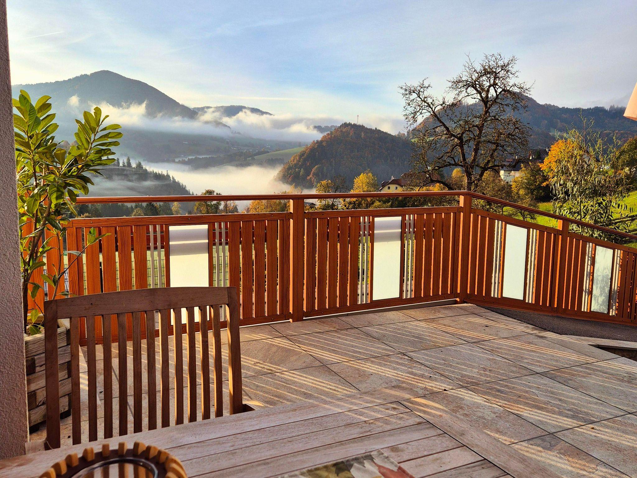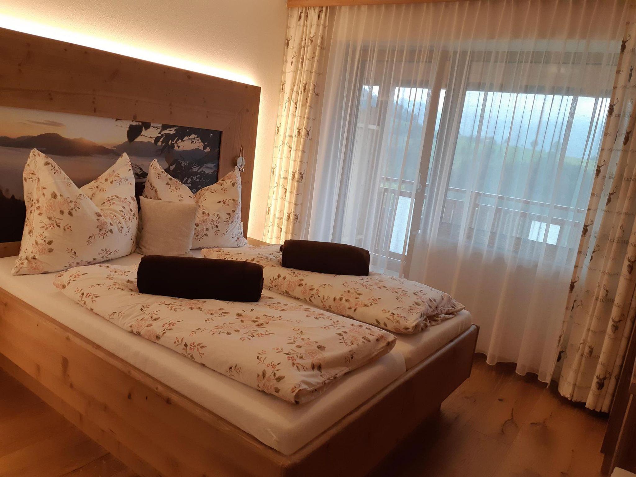 Das Doppelzimmer Morgensonne verfügt über ein großes Doppelbett sowie eine rustikal-moderne Ausstattung. Durch das moderne Badkonzept ist der Sanitärbereich optimal ins Zimmer integriert. Darin befindet sich eine Dusche, ein Waschplatz sowie die Toilette. Hand- sowie Duschtücher liegen für Sie bereit. Der große Balkon lädt mit den gemütlichen Balkonmöbeln zum Verweilen ein. Die wunderschöne Aussicht zur Lindaumauer, in ruhiger Lage, lässt viele entspannte Momente zu.