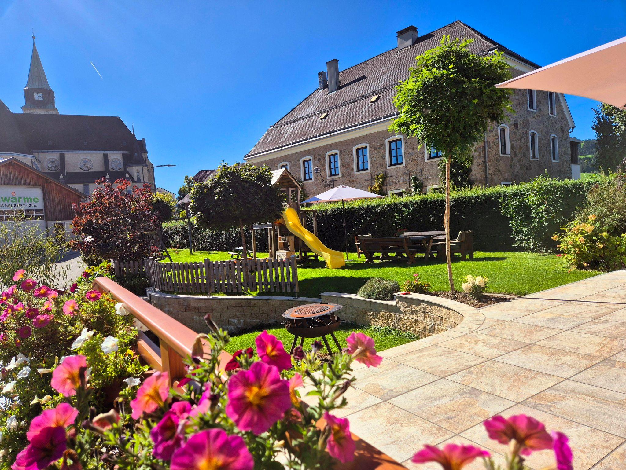 Unsere Unterkunft liegt direkt im Zentrum von Maria Neustift, in sonniger Lage. Auf 613m Seehöhe, bewirtschaften wir 18ha Grünland und 5ha Wald im Nebenerwerb. Als Tierhaltungsform haben wir die Kalbinnenaufzucht gewählt. Da unsere Hofstätte direkt im Ortszentrum - und die Wiesen und Weiden etwas entfernter liegen, weist unser Bauernhof keine typische Hofform auf.