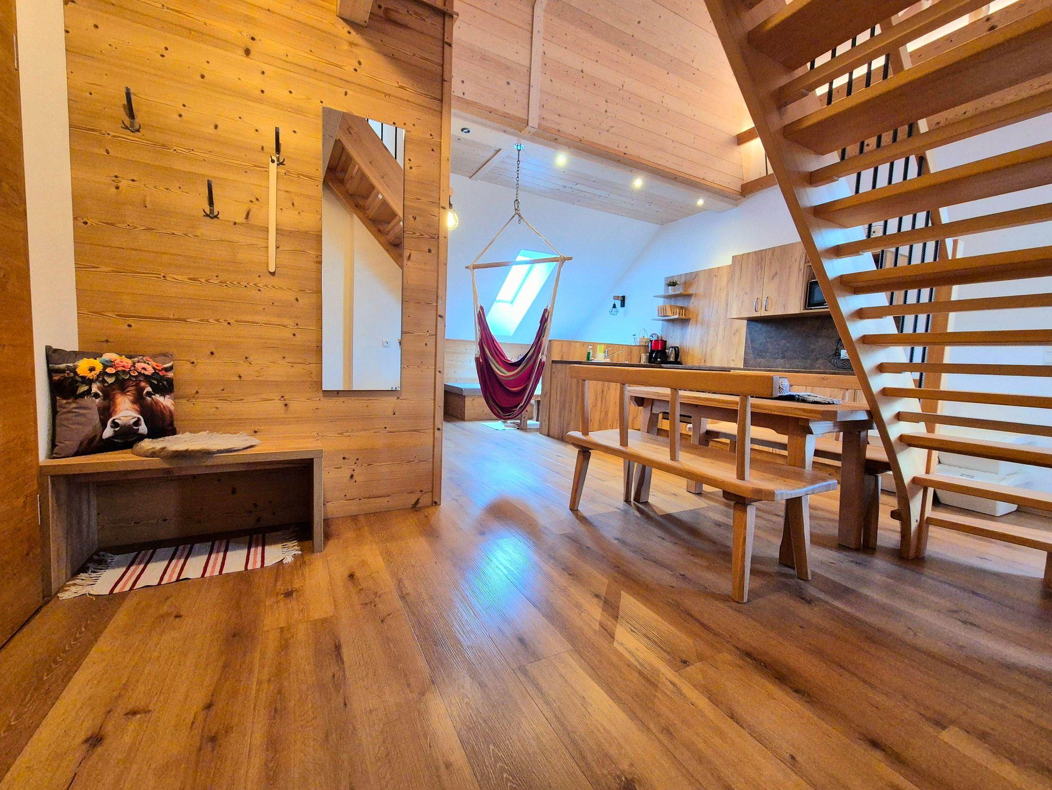 Das Doppelzimmer Morgensonne verfügt über ein großes Doppelbett sowie eine rustikal-moderne Ausstattung. Durch das moderne Badkonzept ist der Sanitärbereich optimal ins Zimmer integriert. Darin befindet sich eine Dusche, ein Waschplatz sowie die Toilette. Hand- sowie Duschtücher liegen für Sie bereit. Der große Balkon lädt mit den gemütlichen Balkonmöbeln zum Verweilen ein. Die wunderschöne Aussicht zur Lindaumauer, in ruhiger Lage, lässt viele entspannte Momente zu.