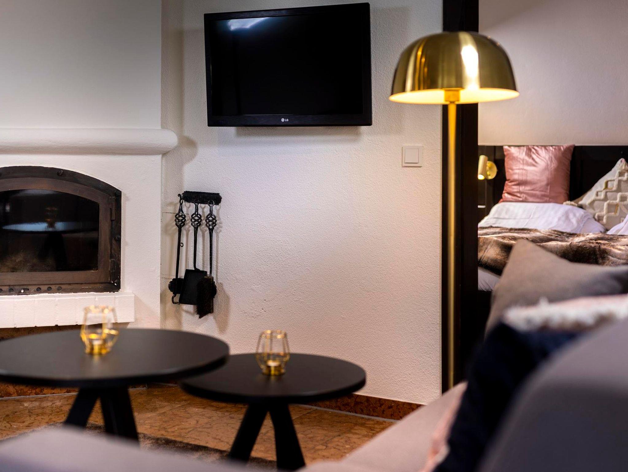 Vorraum, Schlafzimmer, Wohnzimmer, Bad, seperates WC, eigene Sauna, offener Kamin, Sitzecke, Kochnische, Geschirrspülmaschine, SAT-TV, Radio, Telefon, Balkon, Kleidertrockenschrank, kostenloses Internet