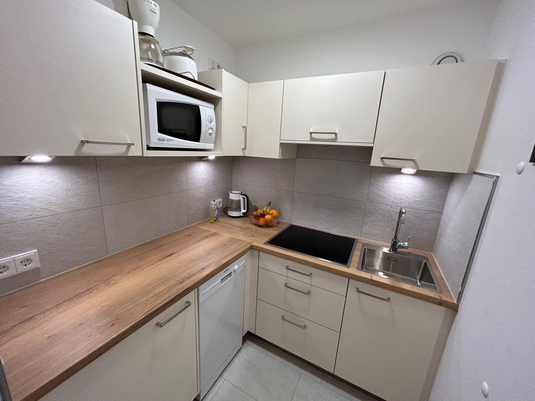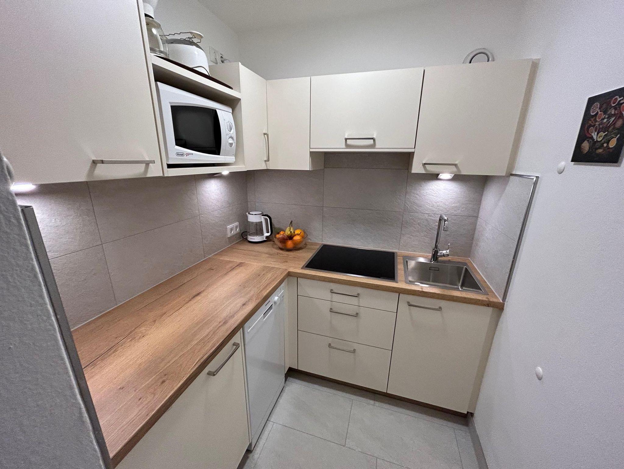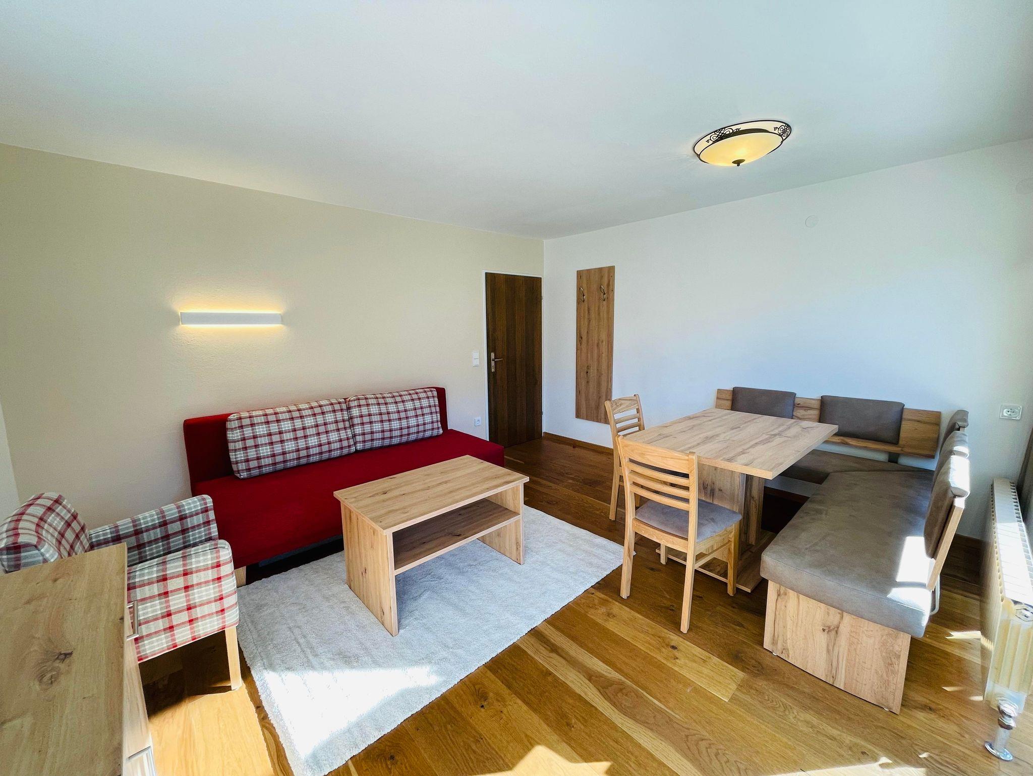 Wohnschlafzimmer mit zwei Couches und Tischchen, gepolsterter Eßecke und Bauernkomode. Dreibettzimmer mit 2 Fauteuils und Tischchen, Wandvertäfelung. Große Schiebetüre zum Liegebalkon bzw. zur Gartenterasse. Vorraum mit Schrank. Frisch renoviertes Badezimmer mit Dusche, Waschbecken, WC und Heizstrahler. Separate Küche mit 3-Platten-Herd, Kühlschrank, Geschirrspülmaschine, Mikrowellenherd, Dunstabzug, kompl. Geschirr, Kaffeemaschine. Farb-TV, Safe, Internetanschluss. Haustiere sind nicht erlaubt!