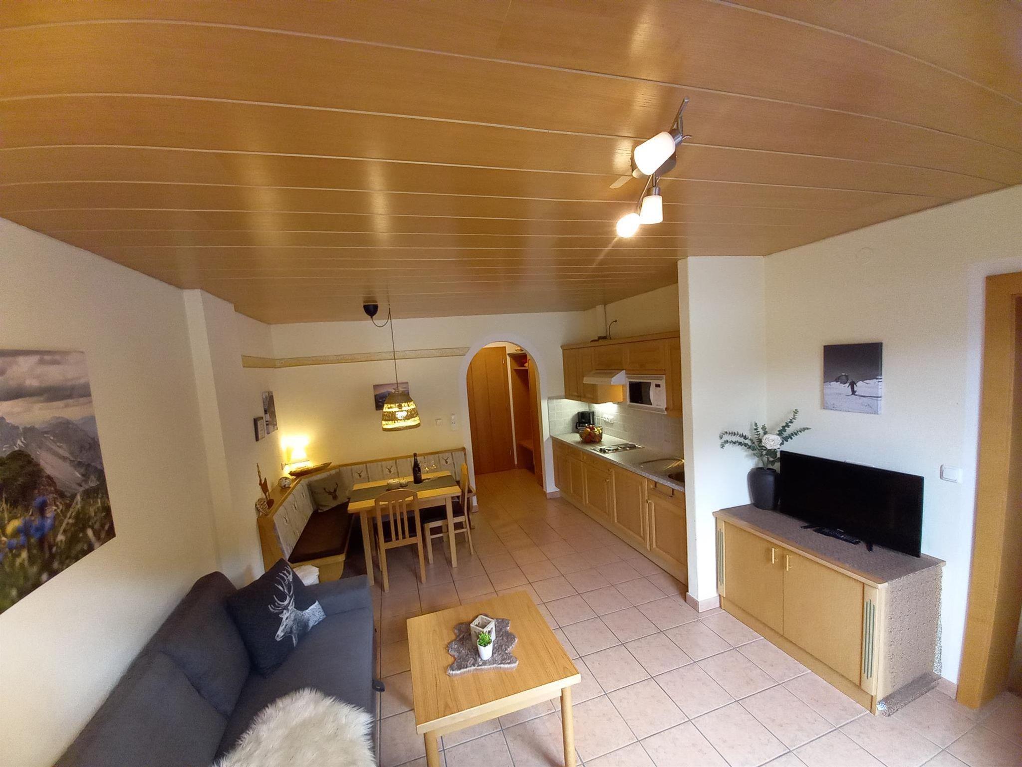 Vorraum/ Garderobe, DU/ WC, Wohnraum mit Eckbank, Küchenblock, ausziehbares Ecksofa, Schlafzimmer mit Doppelbett, Balkon mit Seeblick und ins Karwendelgebirge