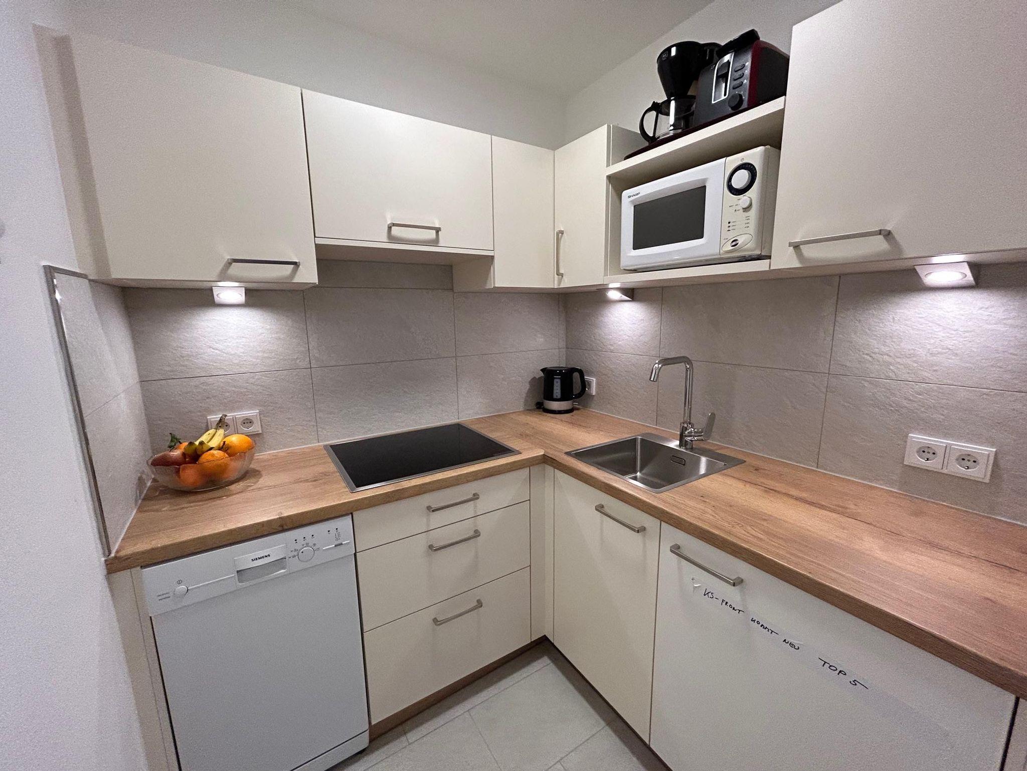 Wohnschlafzimmer mit Doppelcouch, gepolsterter Eßecke und Bauernkomode. Zweibettzimmer mit 2 Fauteuils und Tischchen, Wandvertäfelung. Große Schiebetüre zum Liegebalkon bzw. zur Gartenterasse. Vorraum mit Schrank. Frisch renoviertes Badezimmer mit Dusche, Waschbecken, WC und Heizstrahler. Seperate Küche mit 3-Platten-Herd, Dunstabzug, kompl. Geschirr, Kühlschrank, Geschirrspülmaschine, Mikrowellenherd, Kaffeemaschine. Farb-TV, Safe, Internetanschluss.