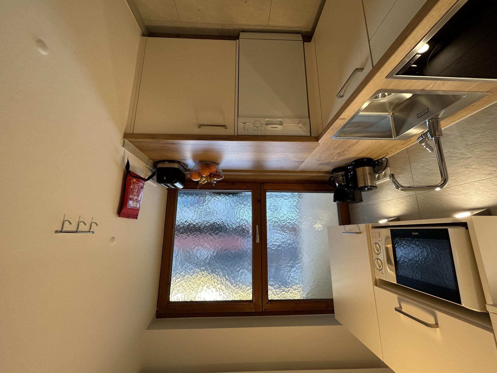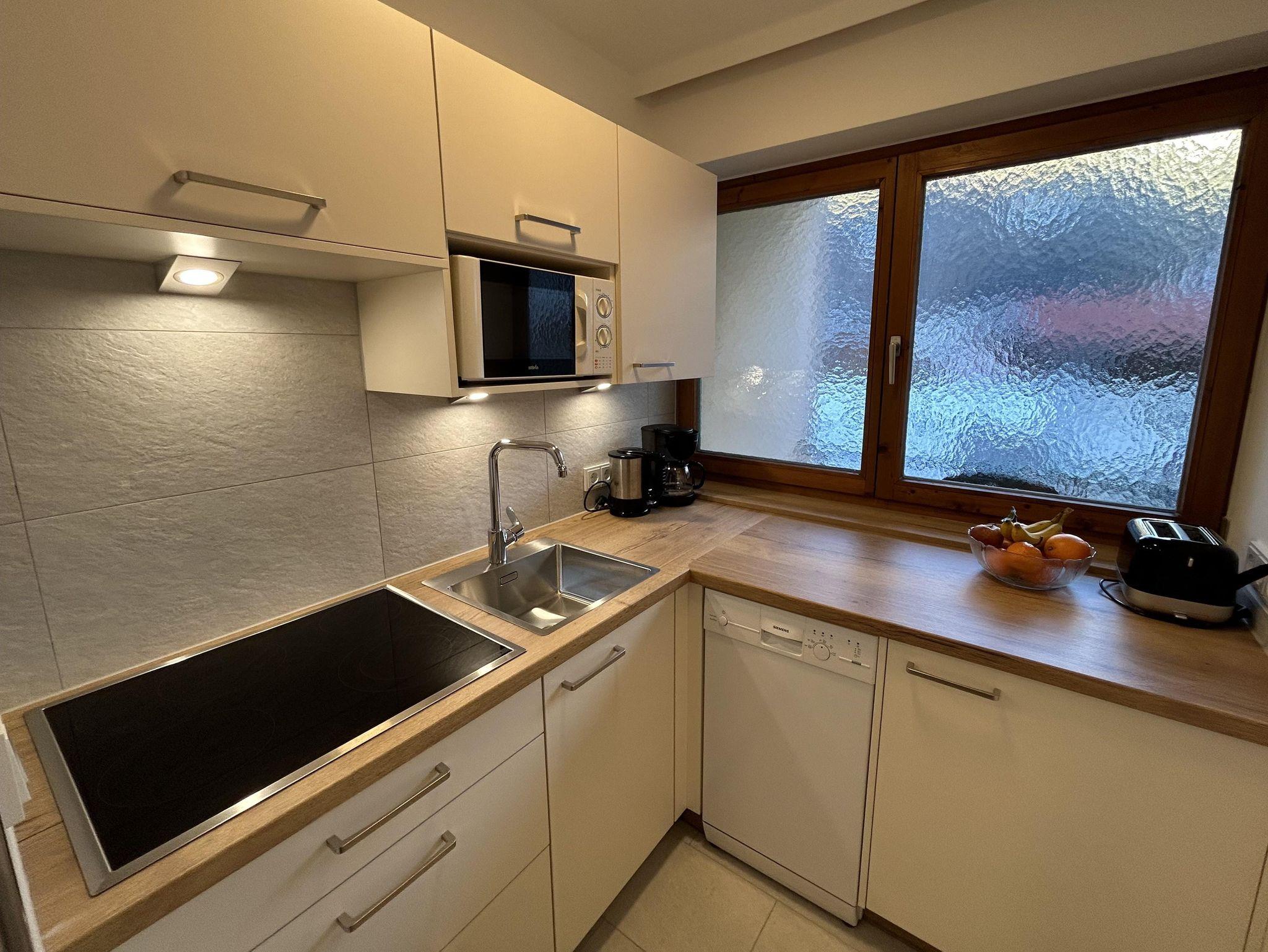 Wohnschlafzimmer mit Doppelcouch, gepolsterter Eßecke und Bauernkomode. Zweibettzimmer mit 2 Fauteuils und Tischchen, Wandvertäfelung. Große Schiebetüre zum Liegebalkon bzw. zur Gartenterasse. Vorraum mit Schrank. Frisch renoviertes Badezimmer mit Dusche, Waschbecken, WC und Heizstrahler. Seperate Küche mit 3-Platten-Herd, Dunstabzug, kompl. Geschirr, Kühlschrank, Geschirrspülmaschine, Mikrowellenherd, Kaffeemaschine. Farb-TV, Safe, Internetanschluss.
