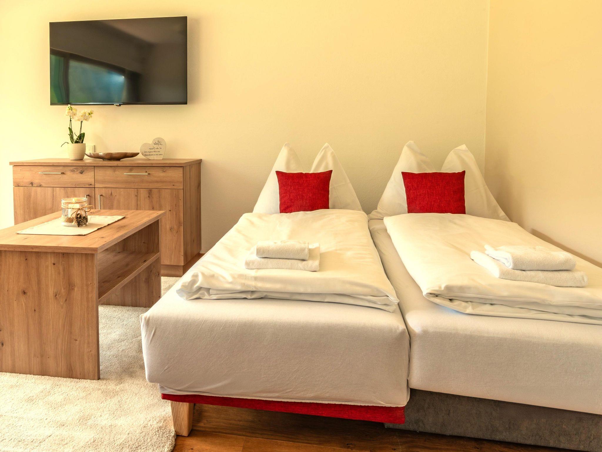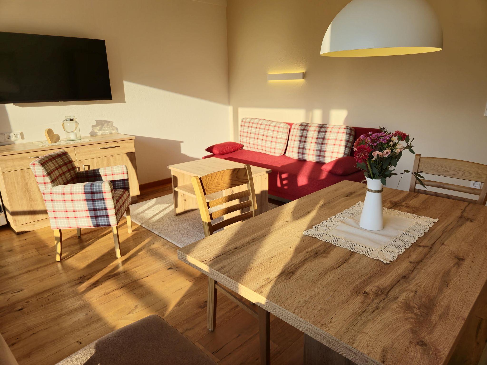 Wohnschlafzimmer mit zwei Couches und Tischchen, gepolsterter Eßecke und Bauernkomode. Dreibettzimmer mit 2 Fauteuils und Tischchen, Wandvertäfelung. Große Schiebetüre zum Liegebalkon bzw. zur Gartenterasse. Vorraum mit Schrank. Frisch renoviertes Badezimmer mit Dusche, Waschbecken, WC und Heizstrahler. Separate Küche mit 3-Platten-Herd, Kühlschrank, Geschirrspülmaschine, Mikrowellenherd, Dunstabzug, kompl. Geschirr, Kaffeemaschine. Farb-TV, Safe, Internetanschluss. Haustiere sind nicht erlaubt!