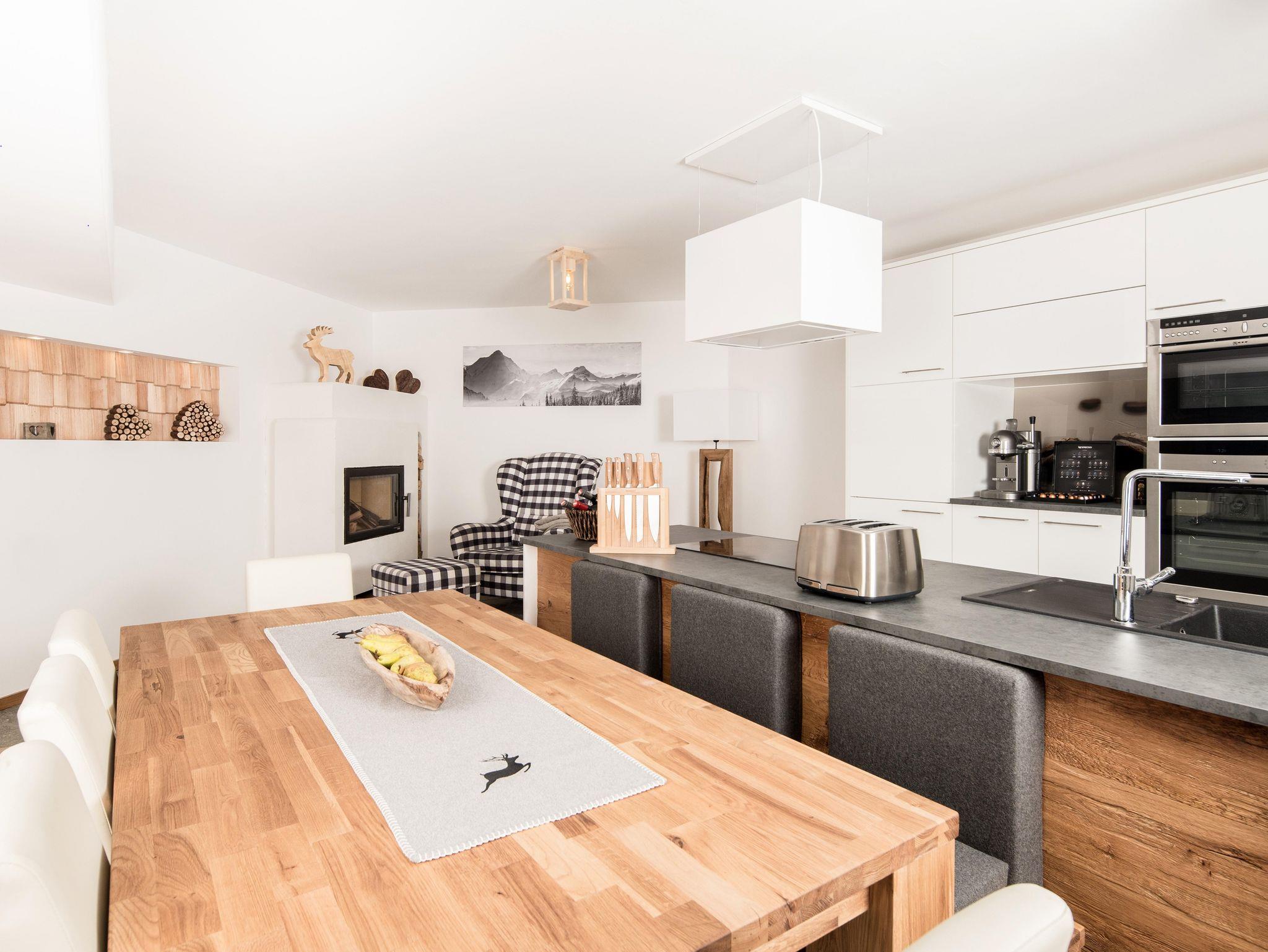Diese Suite liegt im 1. OG, hat 166m² und wurde im alpenländischen Stil eingerichtet. Das Highlight der Suite ist die offene Küche. Diese ist mit modernen Küchengeräten wie Cerankochfeld, Mikrowelle, Backofen, Kühlschrank und Nespresso-Maschine (incl. Kapseln) ausgestattet und verfügt über einen gemütlichen Essbereich. Dieser geht über in den Wohnbereich mit Sofa, Ohrensessel und Altholzwänden. Der Wohnbereich hat dazu einen Kamin und einen Weinkühlschrank. Die vier Schlafzimmer sind 16,5 m² groß. Alle Schafzimmer sind mit einem Flatscreen TV ausgestattet und haben Zugang zum Balkon. Die Bäder sind modern gestaltet mit einer Regendusche, 2 Waschbecken, Toilette sowie Bidet. Ein Bad beinhaltet ein Waschbecken, eine Toilette und eine Dusche.
