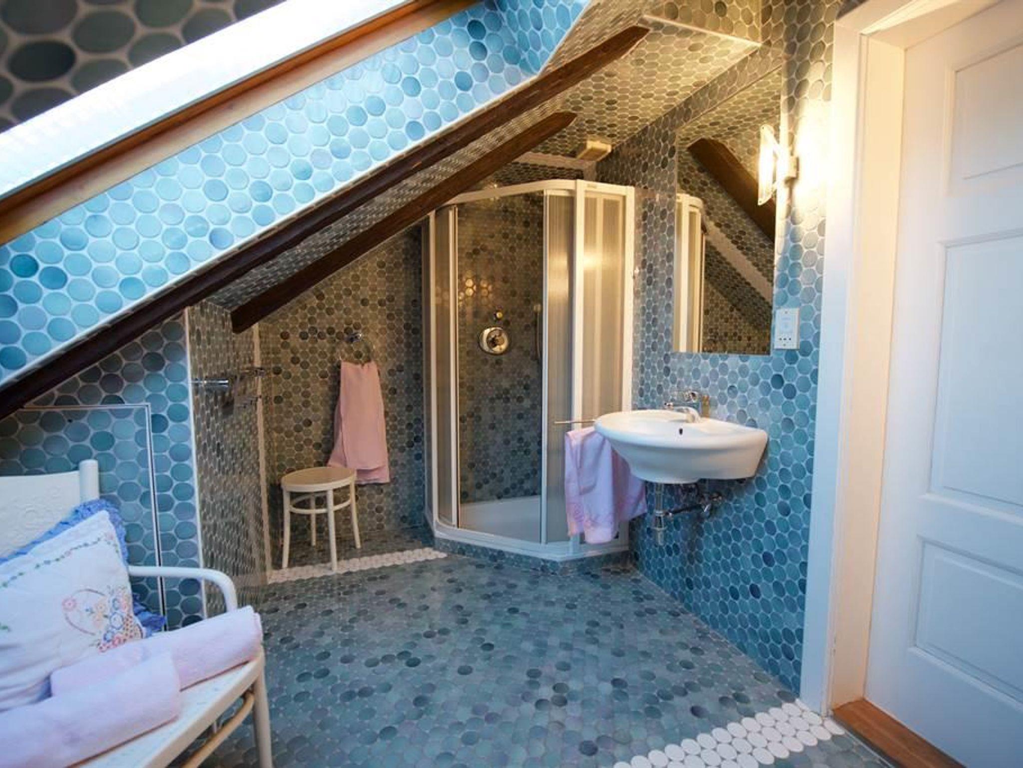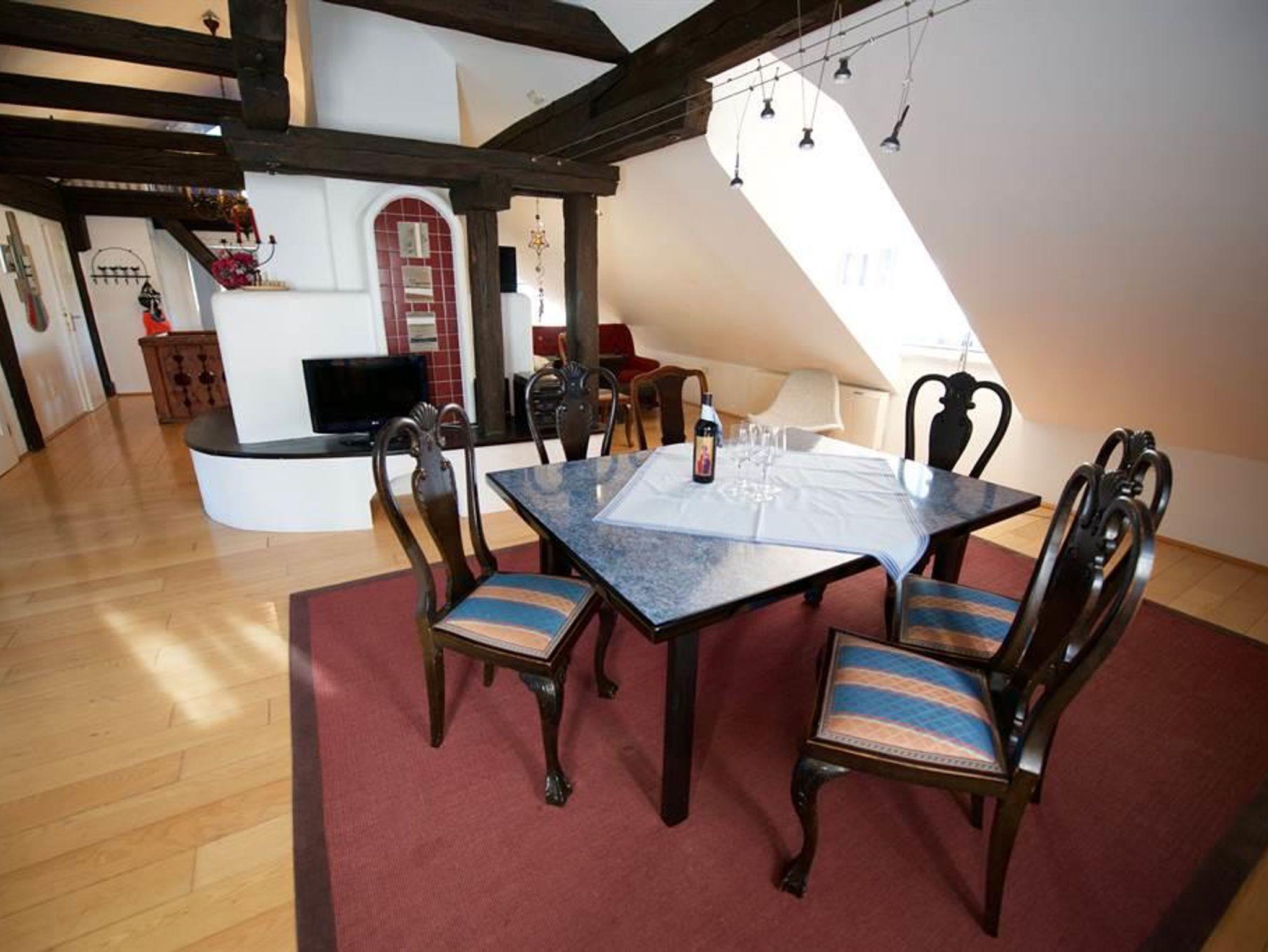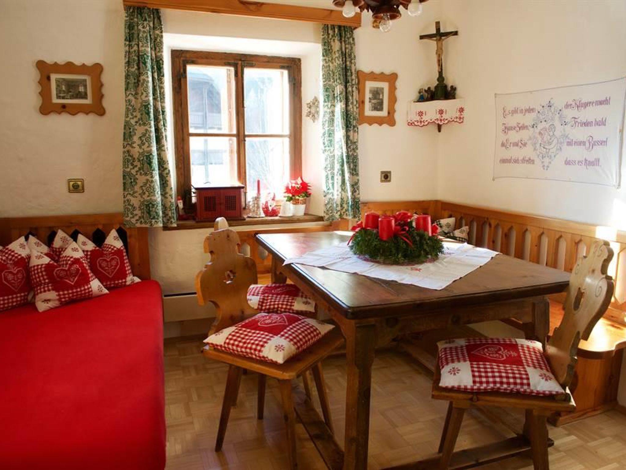 Ca. 100 m², 4 bis 6 Personen, 2 Doppelschlafzimmer, im offenen Dachgiebel 2 Schlafstellen für Kinder (Raumhöhe 1,5 m). Großes Wohnzimmer mit integriertem Küchenteil mit Mikrowelle, Geschirrspüler, Kachelofen, Kabel-TV. Badezimmer mit Doppelwaschbecken und Brausebad, 2 WC seperat, Waschmaschine und Trockner. 2 Balkone und eigener Außenaufgang. Diese Wohnung kann mit der Wohnung im 1. Stock verbunden werden, so dass bis zu 11 Personen Platz finden.
