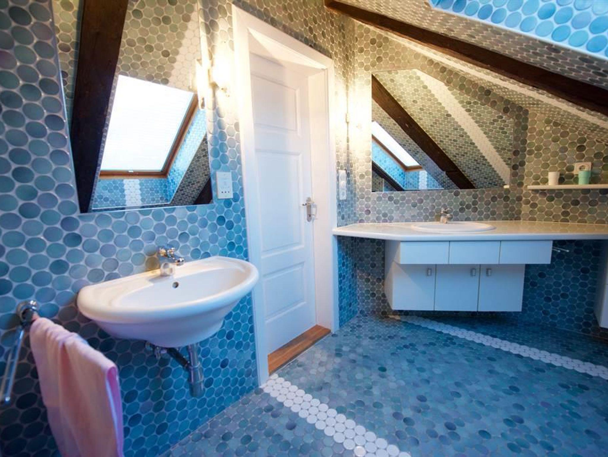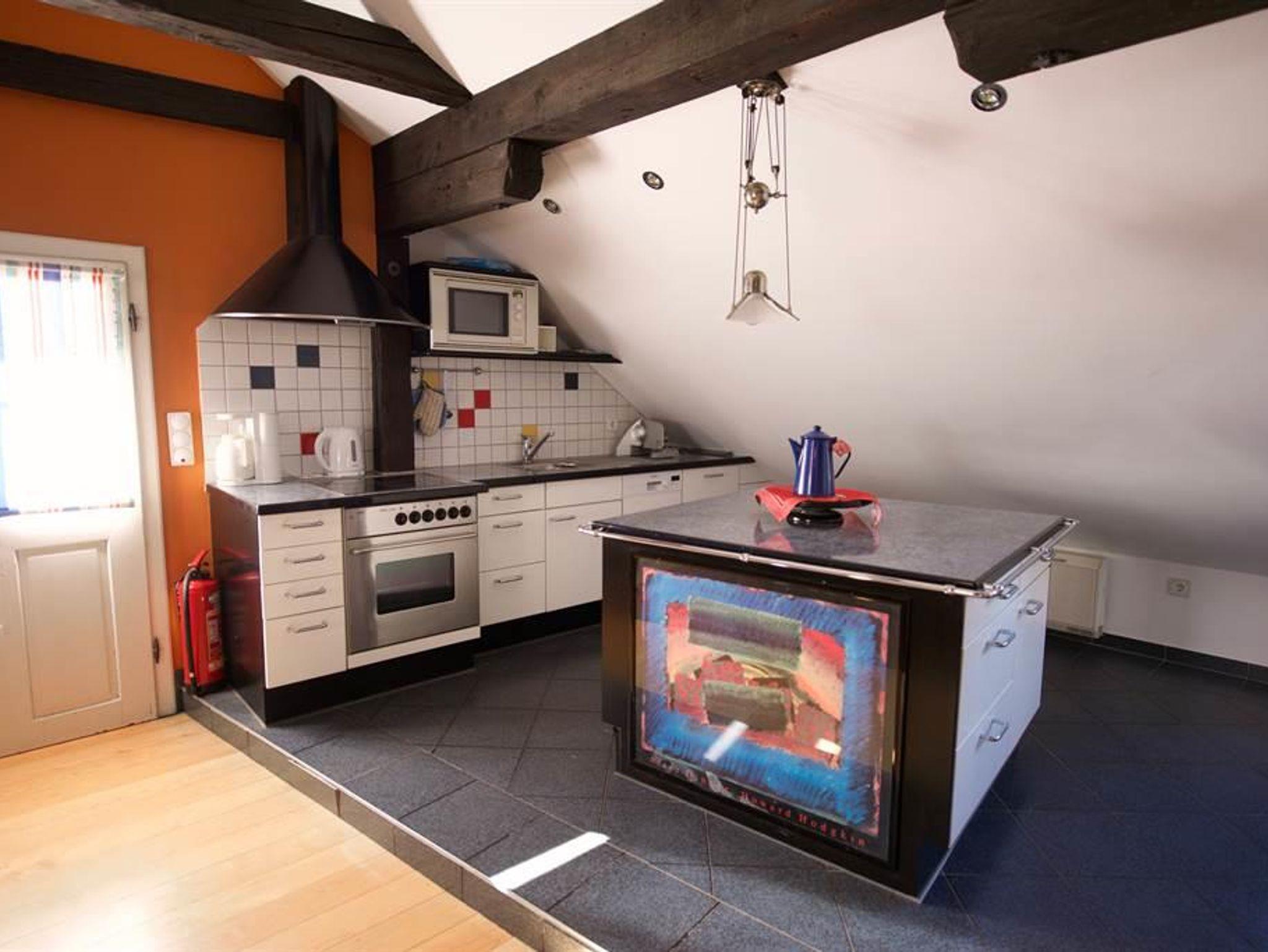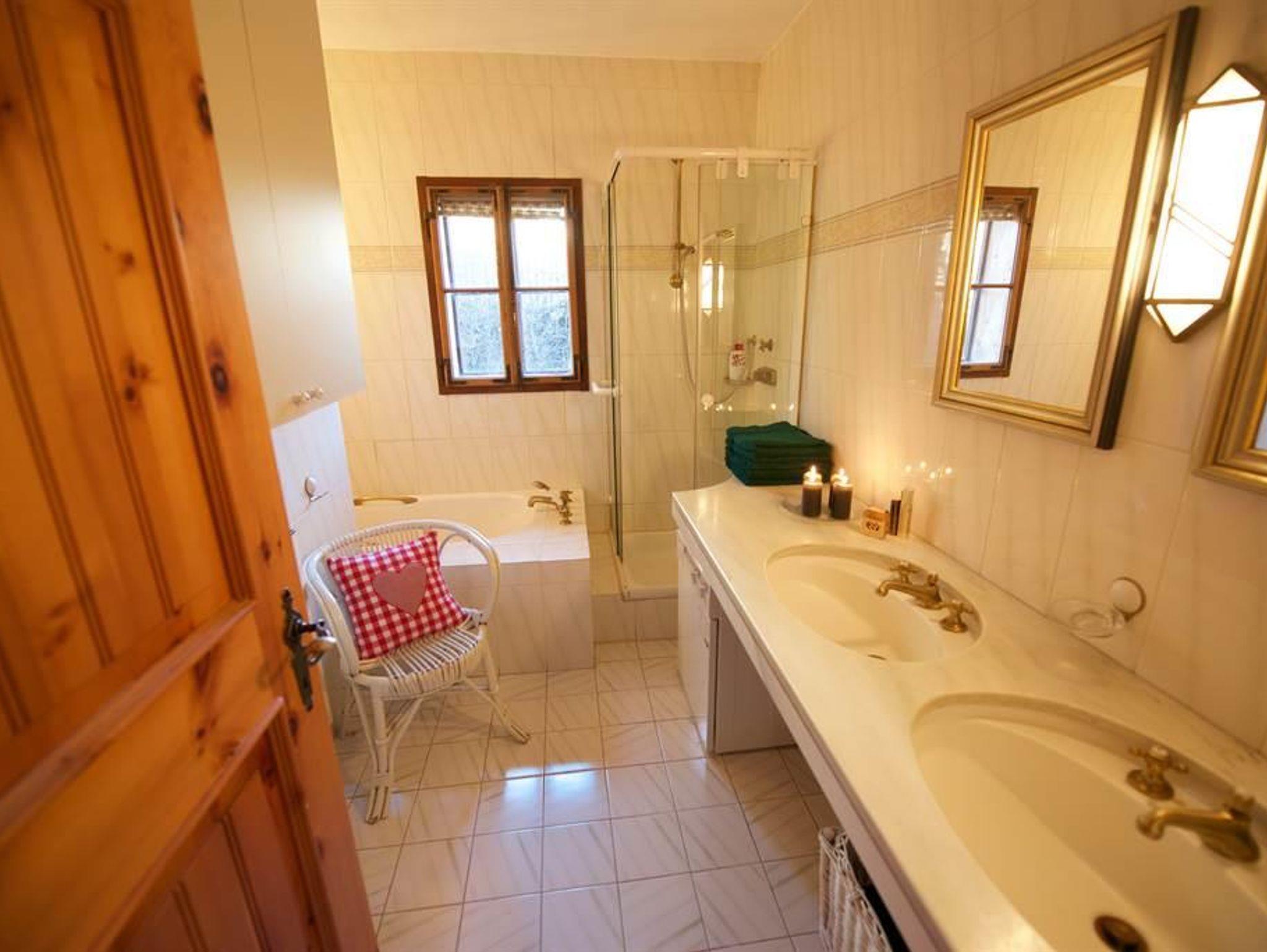Ca. 100 m², 4 bis 6 Personen, 2 Doppelschlafzimmer, im offenen Dachgiebel 2 Schlafstellen für Kinder (Raumhöhe 1,5 m). Großes Wohnzimmer mit integriertem Küchenteil mit Mikrowelle, Geschirrspüler, Kachelofen, Kabel-TV. Badezimmer mit Doppelwaschbecken und Brausebad, 2 WC seperat, Waschmaschine und Trockner. 2 Balkone und eigener Außenaufgang. Diese Wohnung kann mit der Wohnung im 1. Stock verbunden werden, so dass bis zu 11 Personen Platz finden.