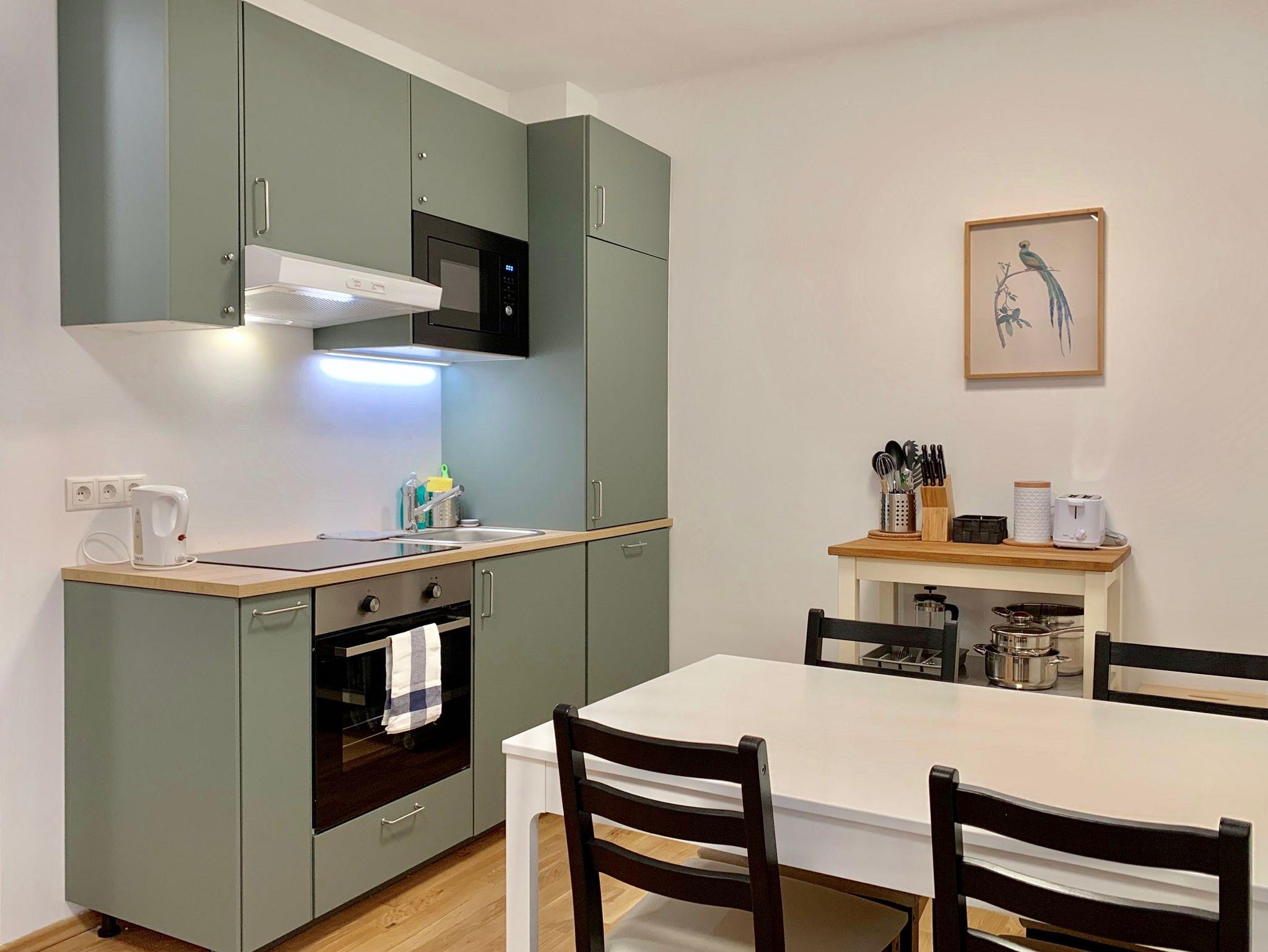• Voll ausgestattete Küche inkl. Backrohr, Kühlschrank mit Eisfach, Geschirrspüler, Mikrowelle, Wasserkocher, Toaster sowie Filter-Kaffeemaschine & Nespresso-Maschine
