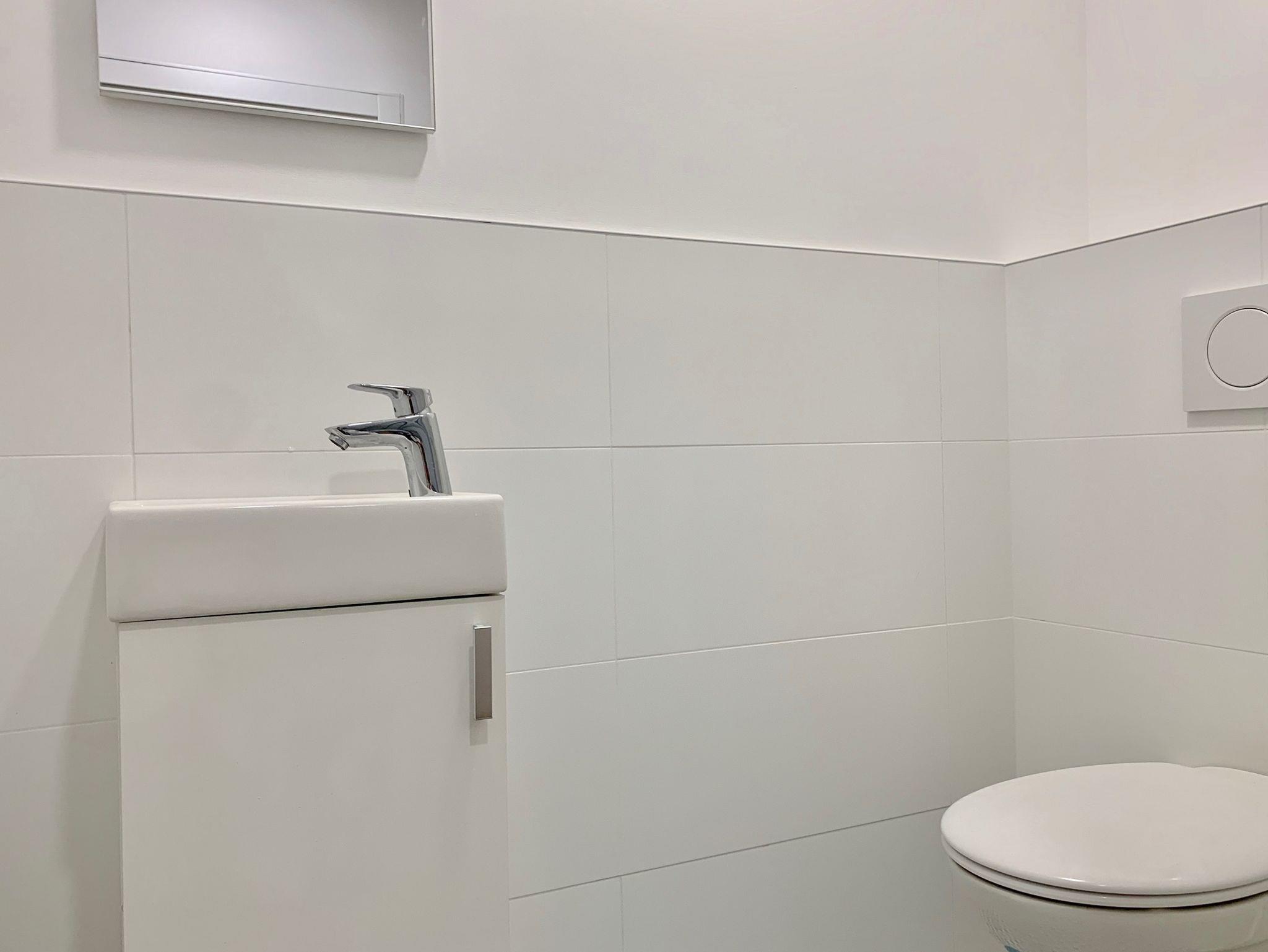 • Modernes Badezimmer mit großer Komfort-Dusche (Grohe), Fußbodenheizung und Handtuchtrockner sowie separates WC