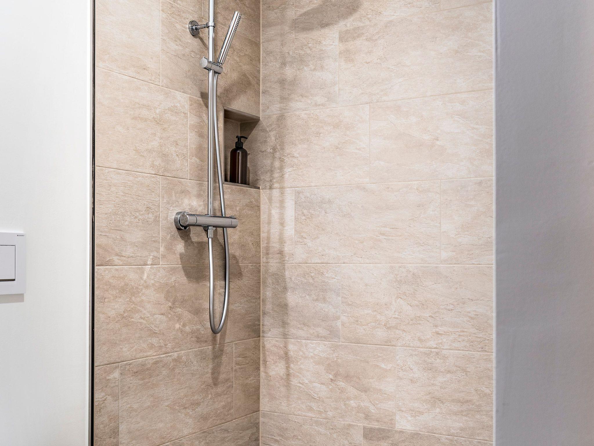 1 Badezimmer mit Dusche. separates WC, Handtücher, Föhn, Eingangsbereich mit Garderobe,