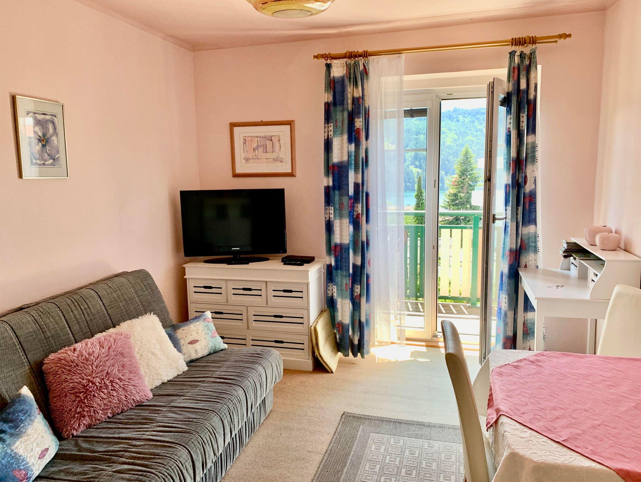 1 Ferienwohnung, südseitig mit Balkon, mit Blick auf die umliegenden Berge und dem See,
