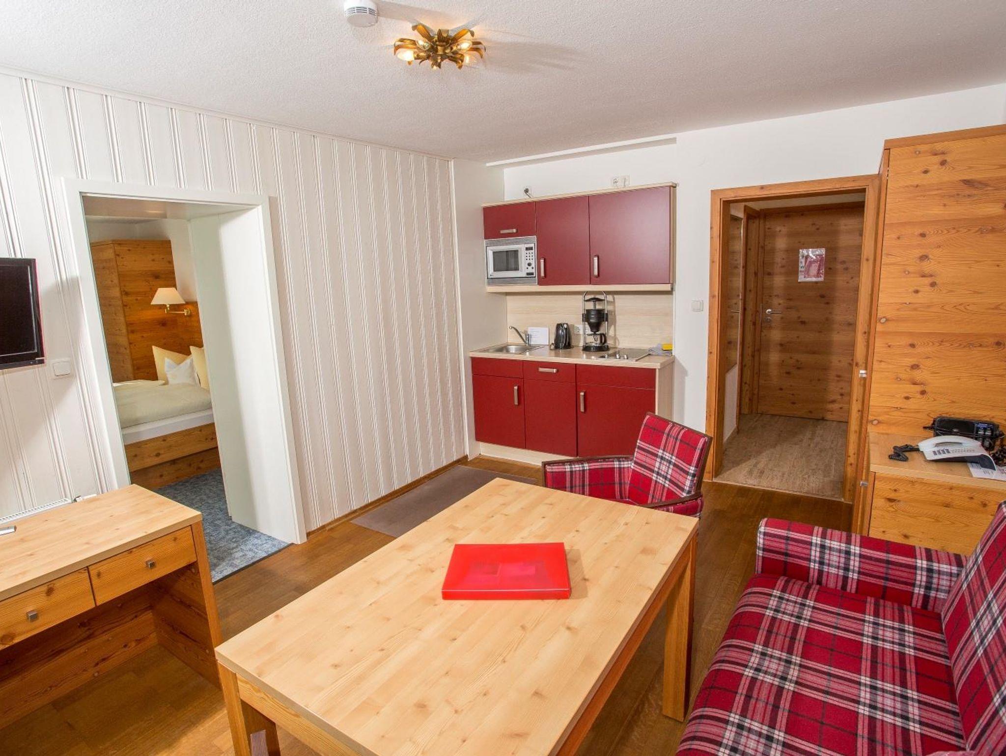 Schlafzimmer mit Doppelbett und Schränke, durch eine Verbindungstür ins Wohnzimmer mit Couch/Essecke, digitalisiertem Flachbildschirm, Radio, Safe und Telefon. Integrierte kleine Küchenzeile mit 2-Plattenherd, Spülmaschine, Mikrowelle, Toaster, Kaffeemaschine, Wasserkocher, vollkommen eingerichtet bei beiden Zimmern Ausgang auf die große Sonnenterrasse mit grandiosem Bergpanorama-Blick Garderobenvorraum Badezimmer mit Dusche/WC, Fön tägliche Reinigung inklusive