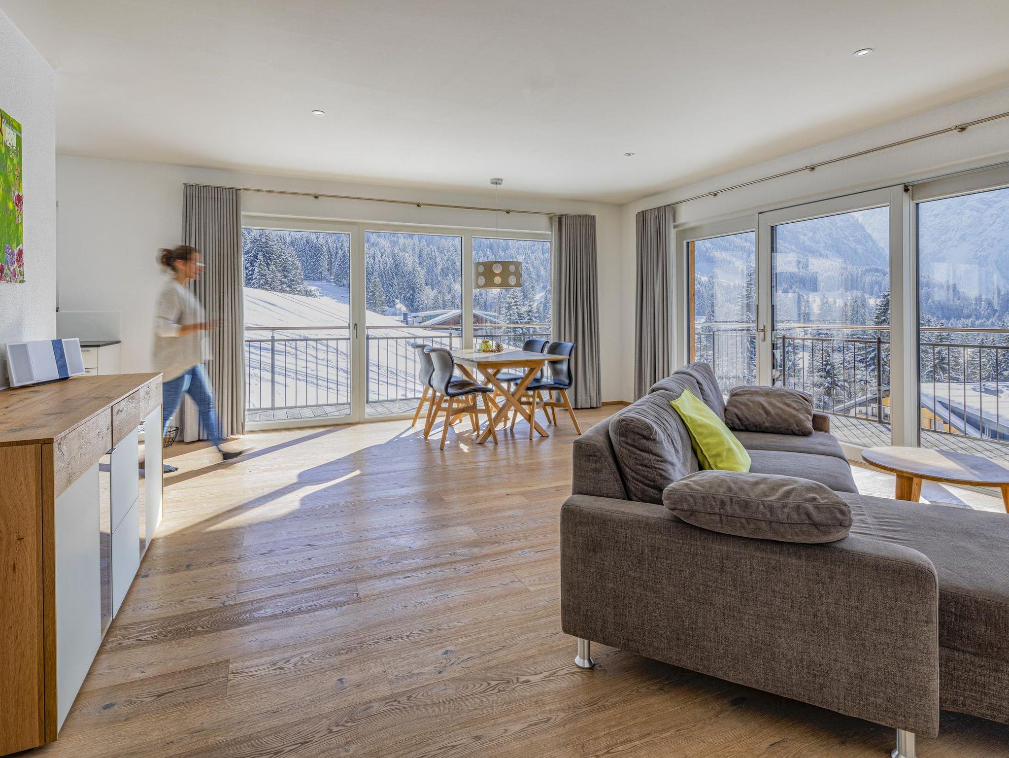 Die Ferienwohnung Widderstein liegt im DG unserer Walser Lodge. Der Blick durch die bodentiefe Fensterfront und den großen Balkon fällt auf das atemberaubende Bergpanorama des Kleinwalsertals. Die moderne Küche ist in den Wohnbereich integriert. Die gemütlichen, fußrandlosen Doppelbetten mit Deckbetten bieten Überlänge (220 cm). Das Bad ist mit Dusche, WC und 2 Waschbecken ausgestattet, zusätzlich gibt es ein weiteres WC. Erholen Sie sich im Saunabereich mit Panorama-Ruheraum!