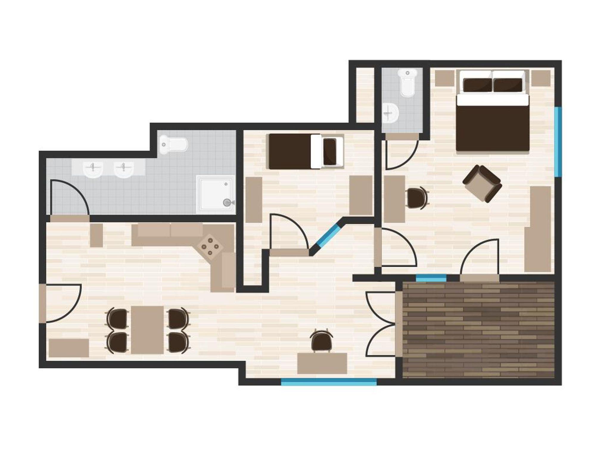Unser Apartment Topas mit ca. 60 qm. verfügt über ein Elternschlafzimmer, Kinderzimmer mit Stockbett, L-Küche mit großen Kühlschrank, 4er Ceranfeld, Mikro/Backofenkombination, Voll ausgestattet, Sitzecke, Badezimmer mit begehbarer Dusche, Doppelwaschbecken, WC plus WC separat, große Flachbildfernseher, WIFI Hotspot, Balkon mit Nord-Ostausrichtung.