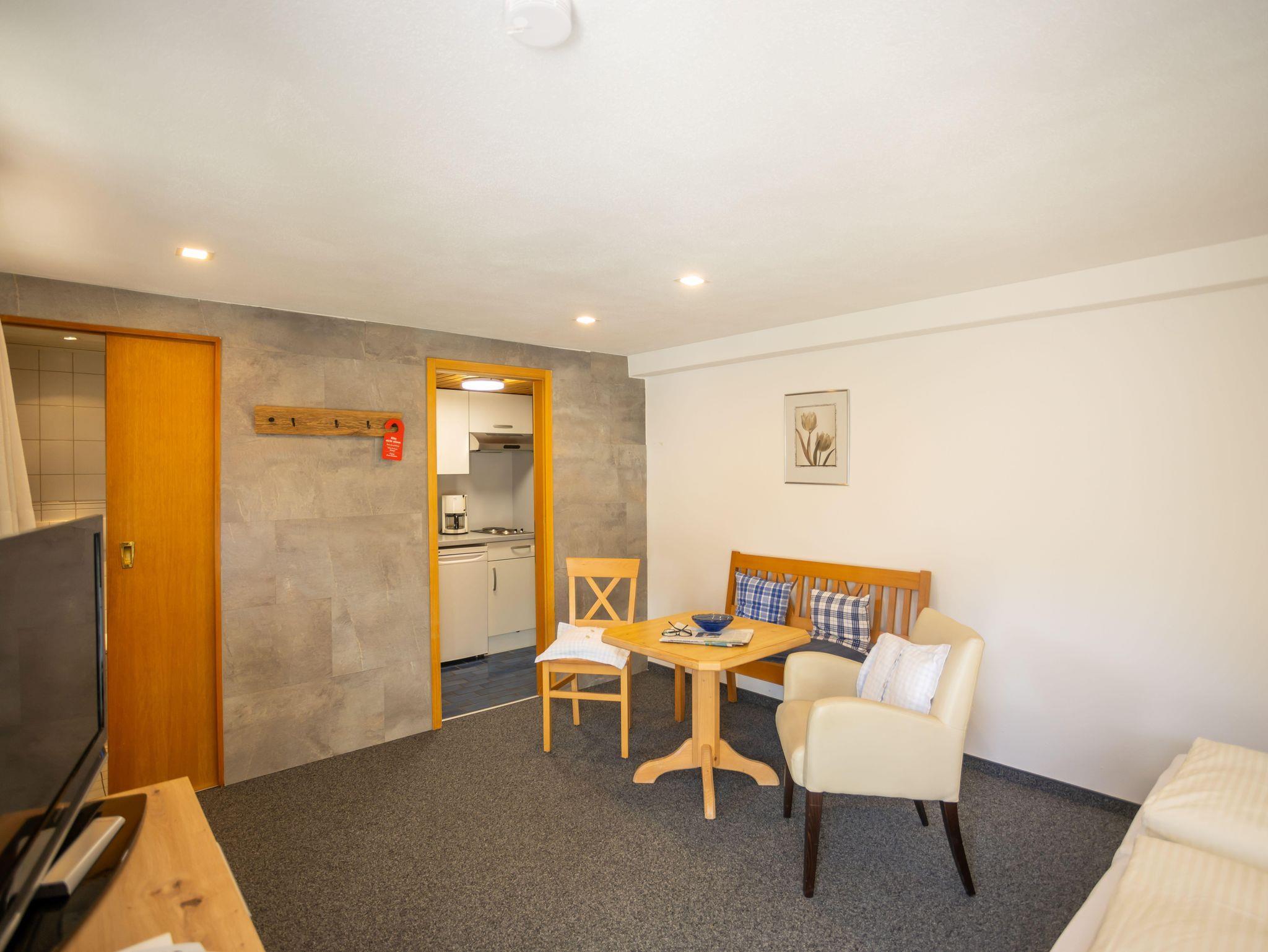 Ein Wohnschlafraum mit Doppelbett, Sitzecke, digitalisiertem Flachbildschirm, Safe, Radio, Telefon, separate Küche, vollkommen eingerichtet, Dusche/WC, Fön. Auf Wunsch mit Frühstücksbuffet buchbar, ebenerdig gelegen, ohne Balkon, Eingang vom Parkplatz aus, KEIN W-Lan Empfang ! (gerne aber kostenfrei nutzbar im Hirschstüble)