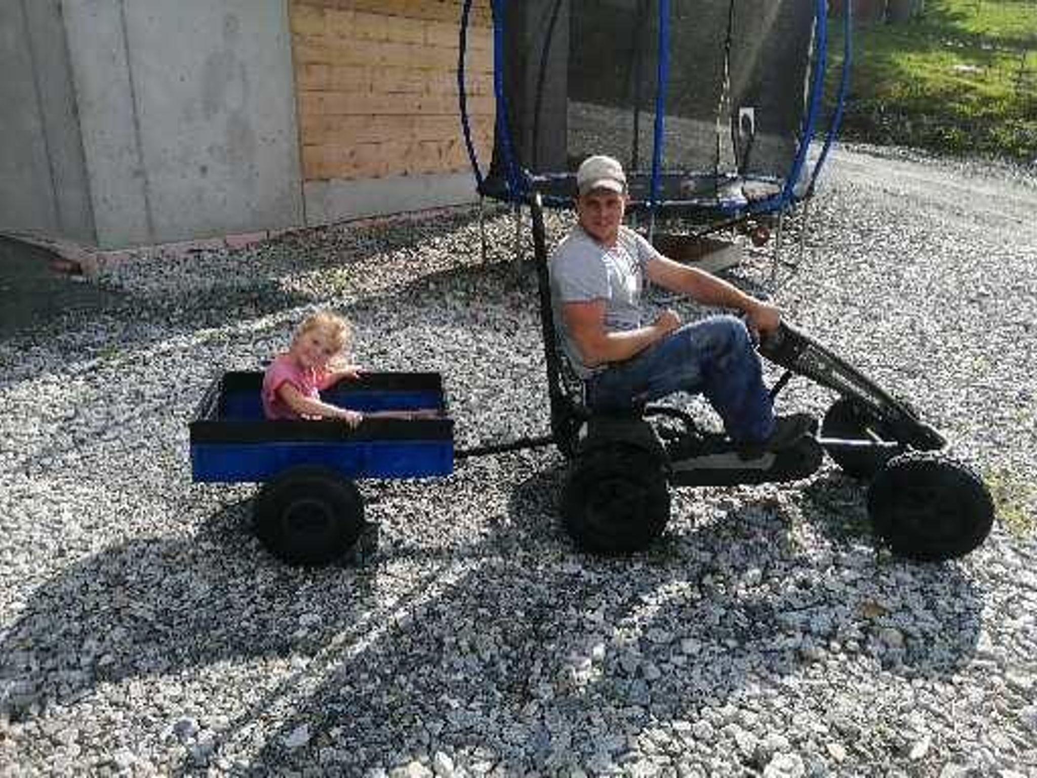 Auf die Kinder wartet ein Trampolin, Gro-Karts, Ballspiele, Sandkasten, Trettraktor.