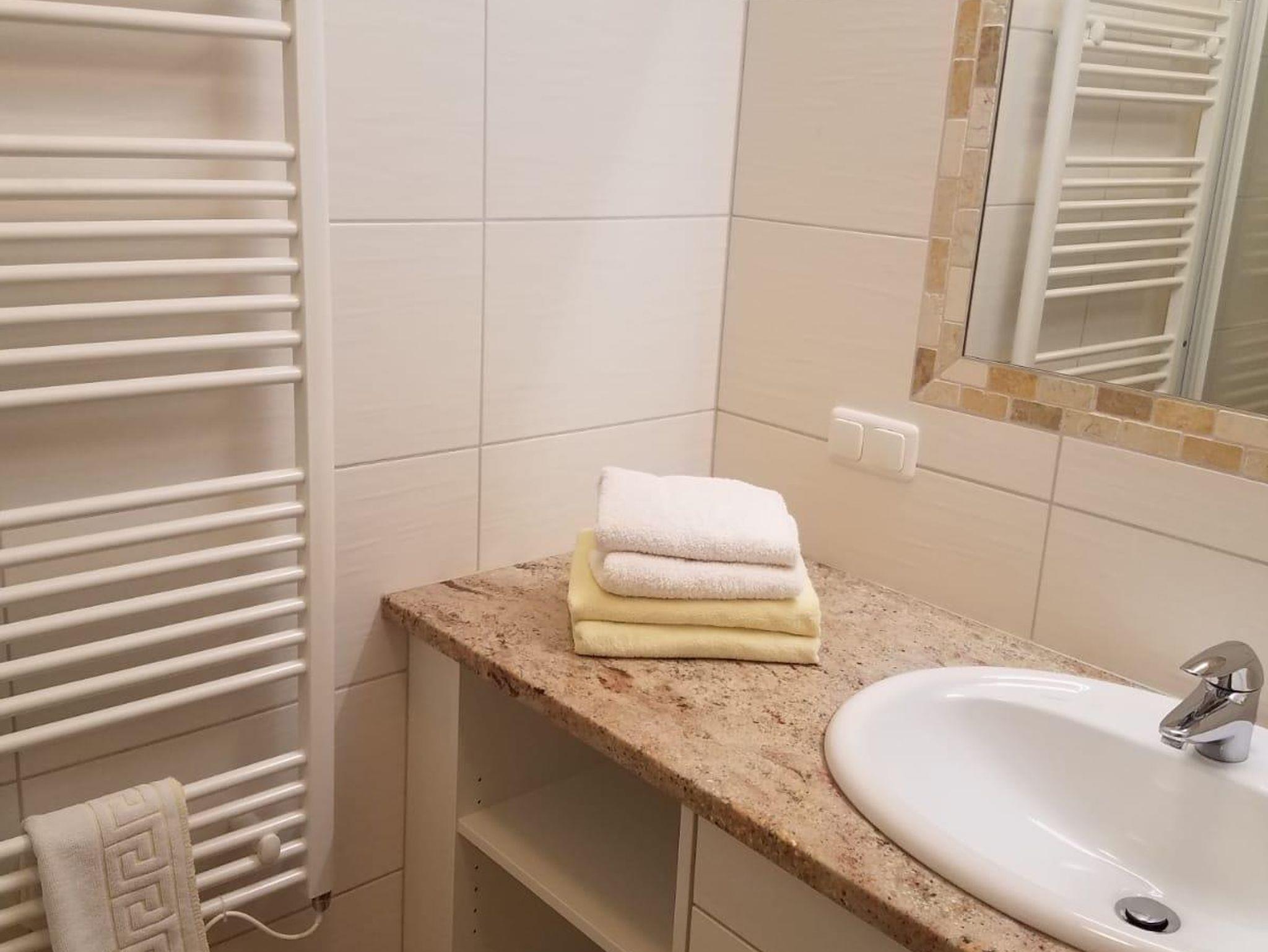 • helles Badezimmer mit Dusche, WC, Handtuchtrockner & Föhn