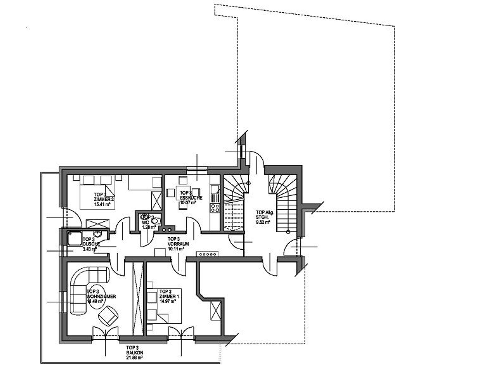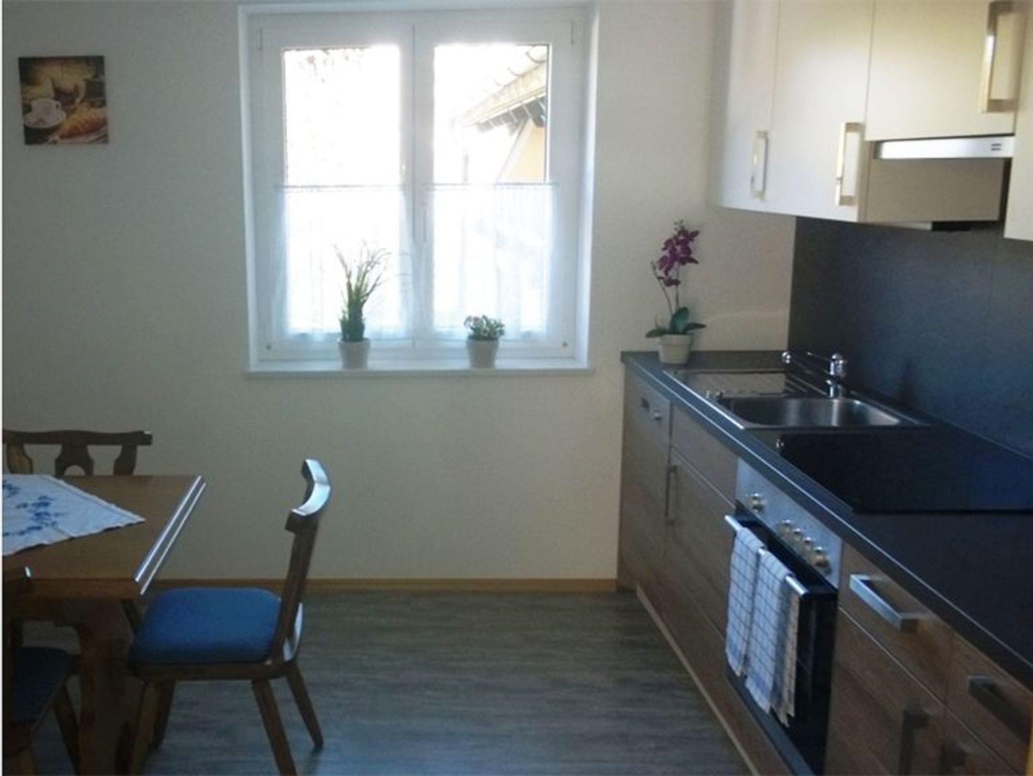 FW3 Schafberg befindet sich im 1. Stock und besteht aus 2 Schlafräumen, Küche mit Essbereich, Wohnschlafzimmer, Dusche und WC getrennt. Der Balkon auf der Süd- und Ostseite, der über alle Zimmer erreichbar ist, bietet eine traumhafte Aussicht auf die Berge und ein Wildgehege.