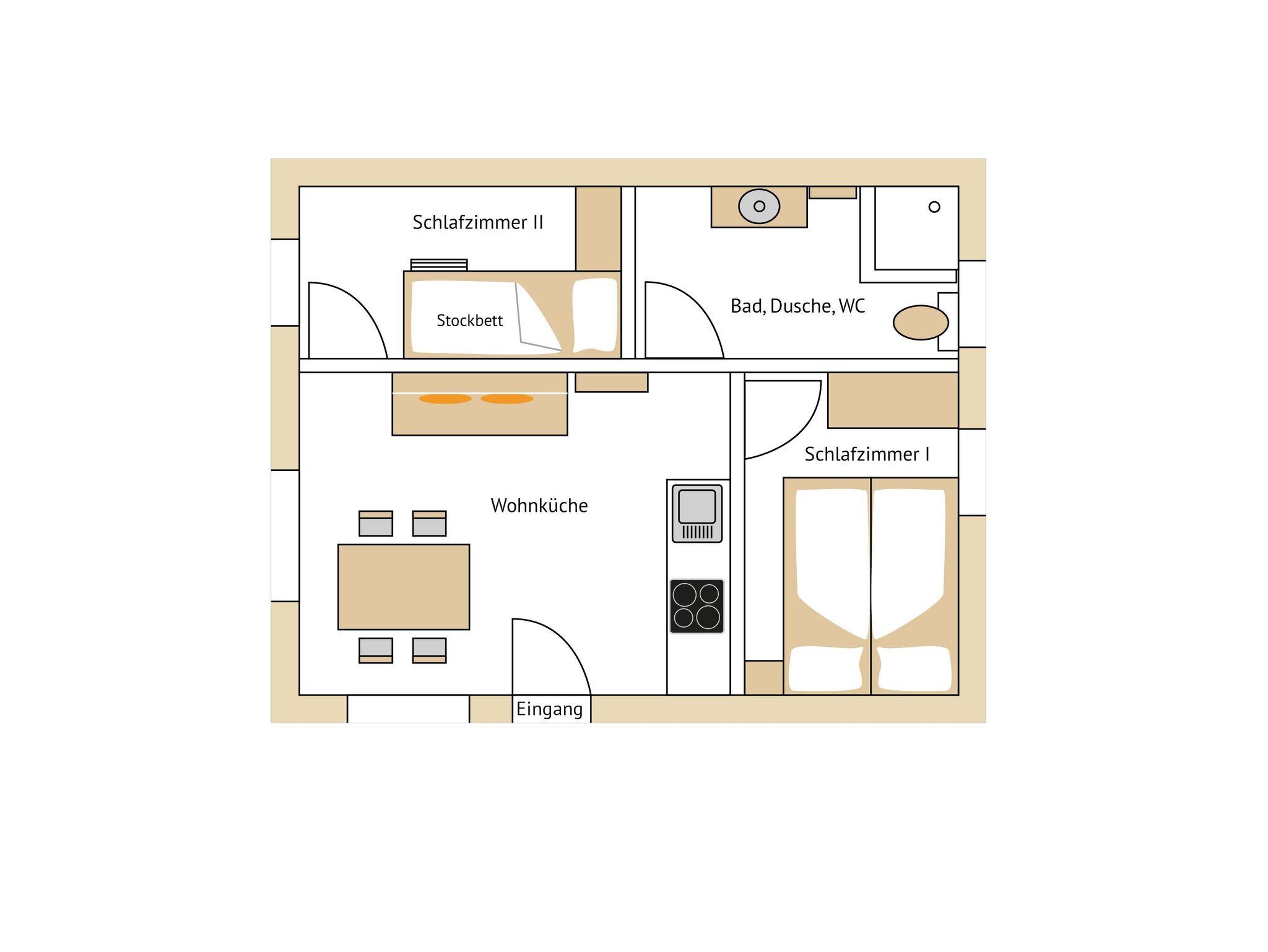 2 Schlafzimmer (1 Doppelbett und 1 Stockbett)
